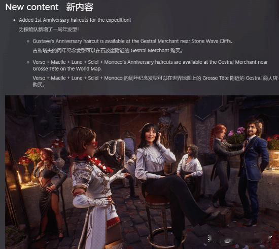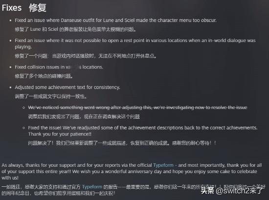 3..多项小bug修复,比如某些场景下对话时无法打开休息点、场景碰撞等问题,成就文本调整(出现了一些问题,但官方已紧急修复并致歉)。