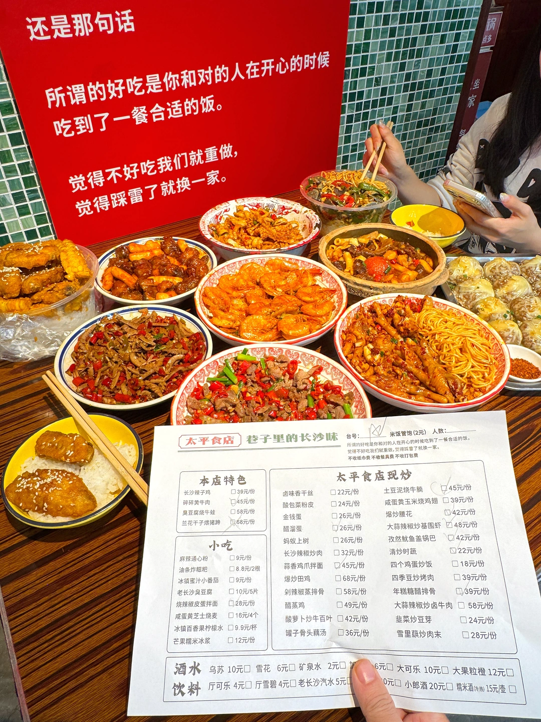 叫:太平食店、人均才四十左右,老板厨师都是正宗长沙老师傅、就在太平老街旁边!!
