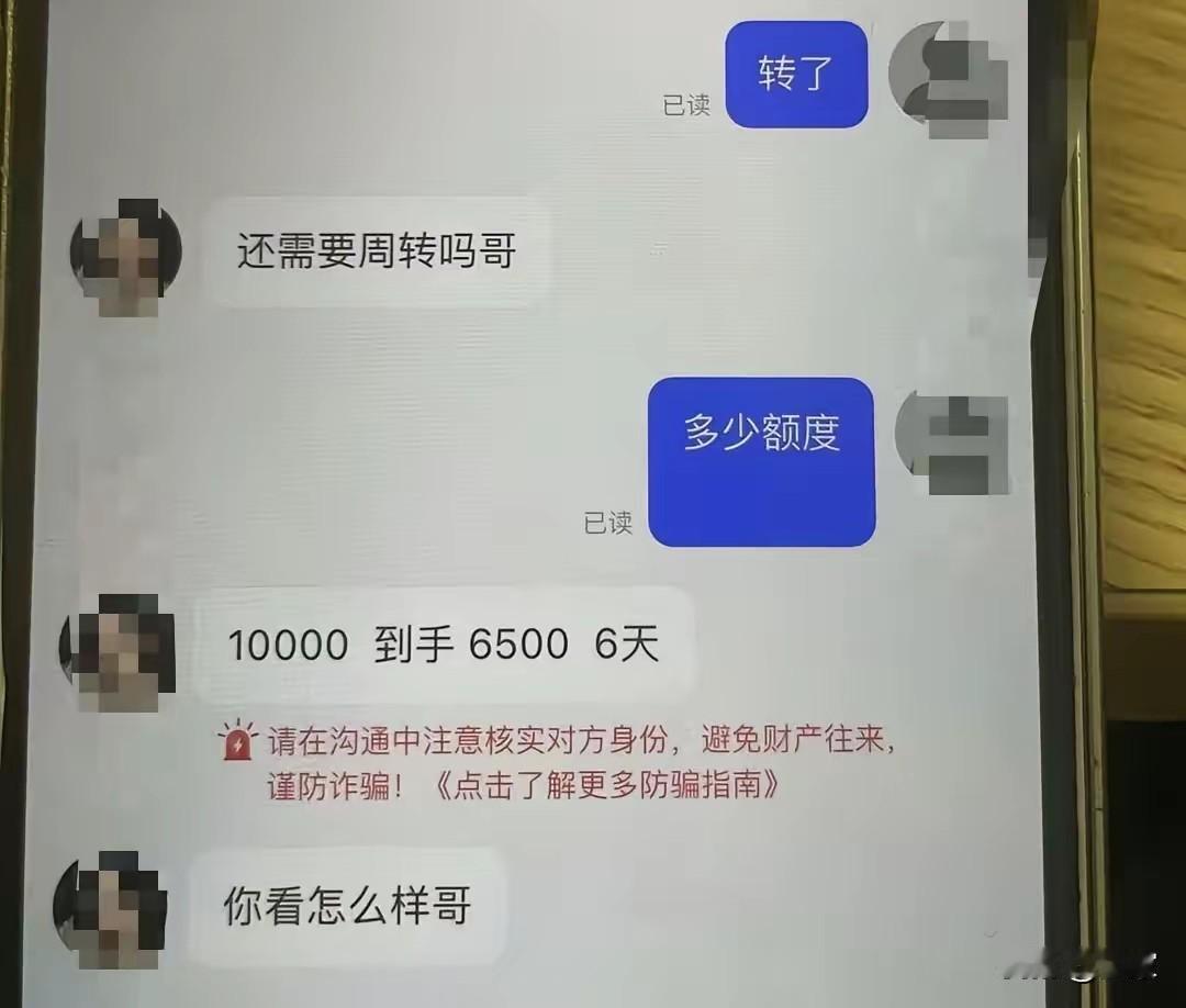“需要周转吗哥,10000到手6500,6天,你看怎么样哥”,这是最近网友@成熟叶子SW在社交平台上发的截图,话说现在这些放高利贷的都这么张狂了吗?就连不认识的人,加上微信就这样问,难道他们不知道发放高利贷是违法的吗?