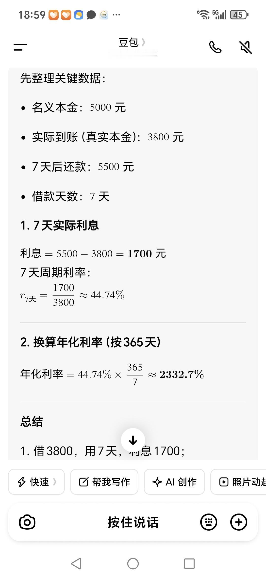 再往下看我感觉就更加的惊讶了,因为我们看到的是待还金额是5500元,还款日是4月24日,说白了就是贷款周期是7天,好家伙,这一出被预先扣除了1200元,一斤又还款1700元,仅这一笔贷款就快赶上实际到账的本金了,不夸张的说,按照年利率计算的话,这笔贷款年利率高达2332%,属于典型的超利贷,这种贷款,你现在还敢借吗?