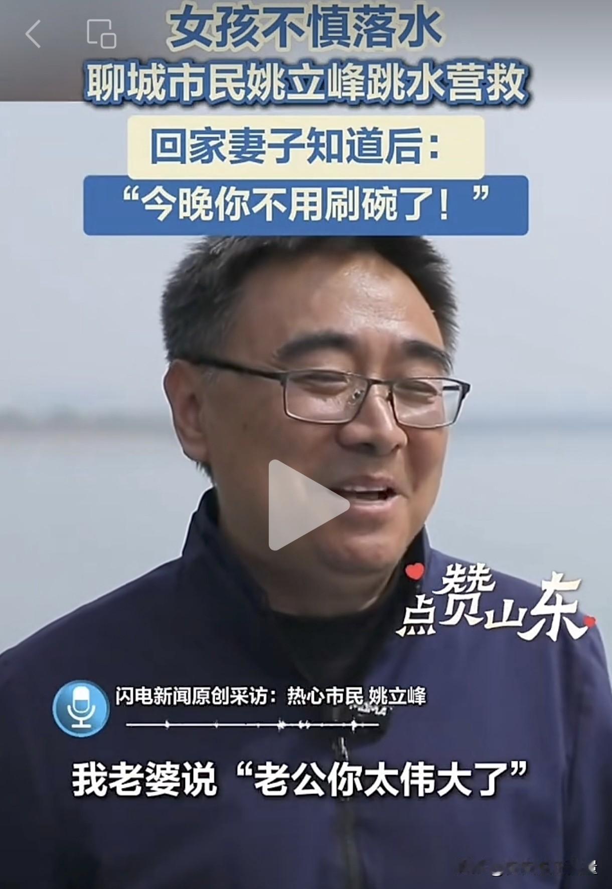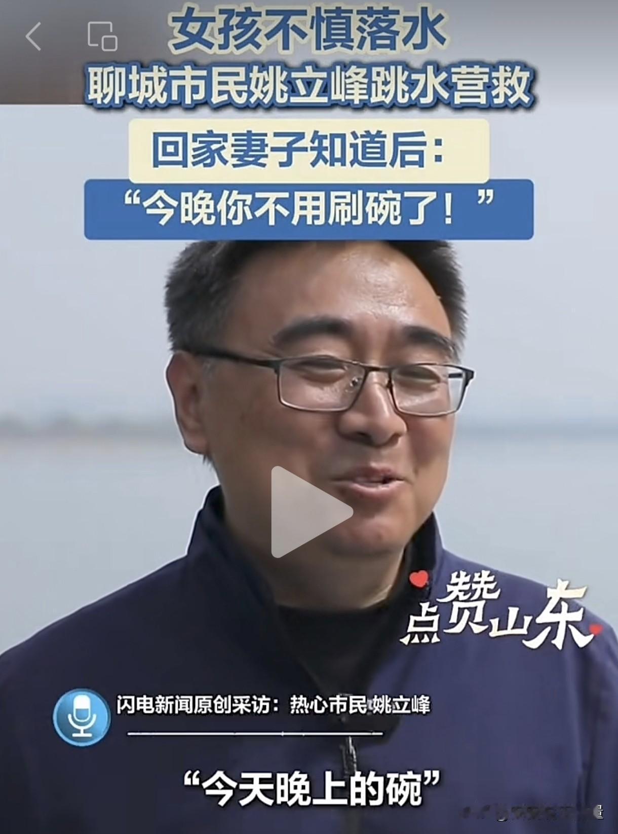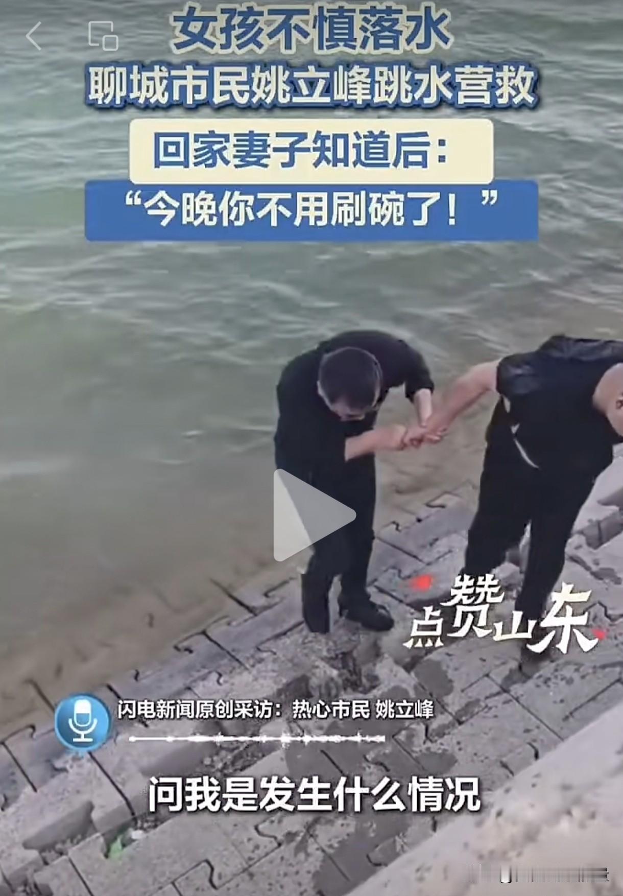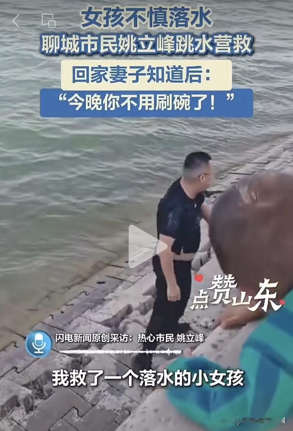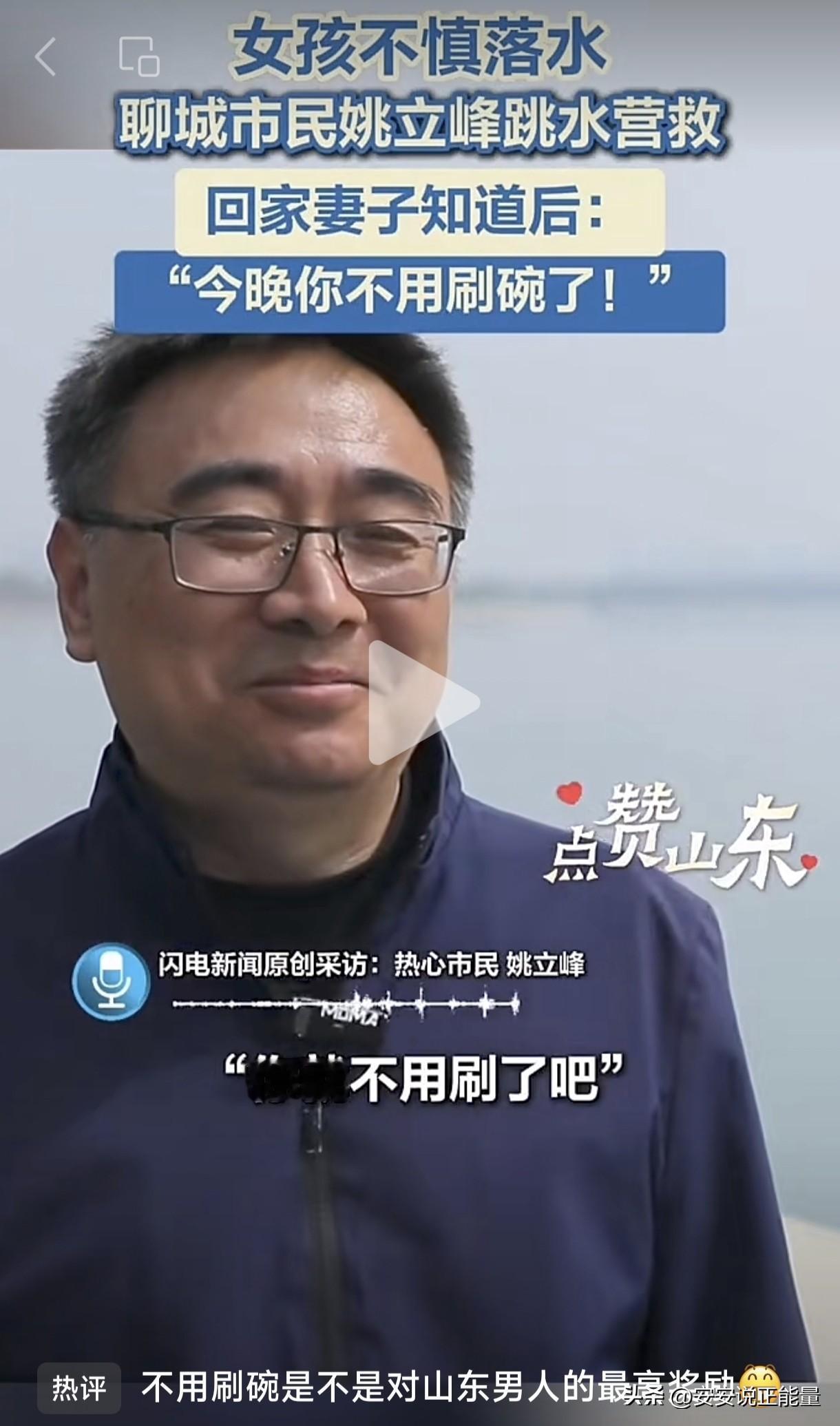 不用洗碗是不是对山东男人最大的奖励呀?山东聊城一名男子见义勇为,奋不顾身跳进河里救了一个溺水小女孩。妻子了解情况后,当场夸赞男子好厉害,并宣布今晚不用他洗碗了。