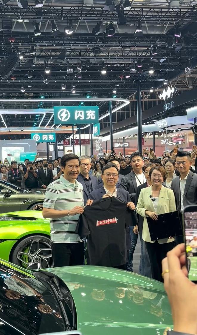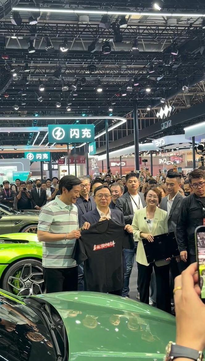这次北京车展,各大新势力品牌争相亮相,中国汽车又出圈了。不管是创新技术还是首发车型,都吸引了全球的关注。雷军身为小米汽车老总,先后去到多个新势力品牌展台,并赠送了不同的定制T恤。在比亚迪方程豹展台,他给王传福送上了一件“在一起才是中国汽车”定制T恤,王传福也回赠了一个“方程豹”纪念徽章礼盒。