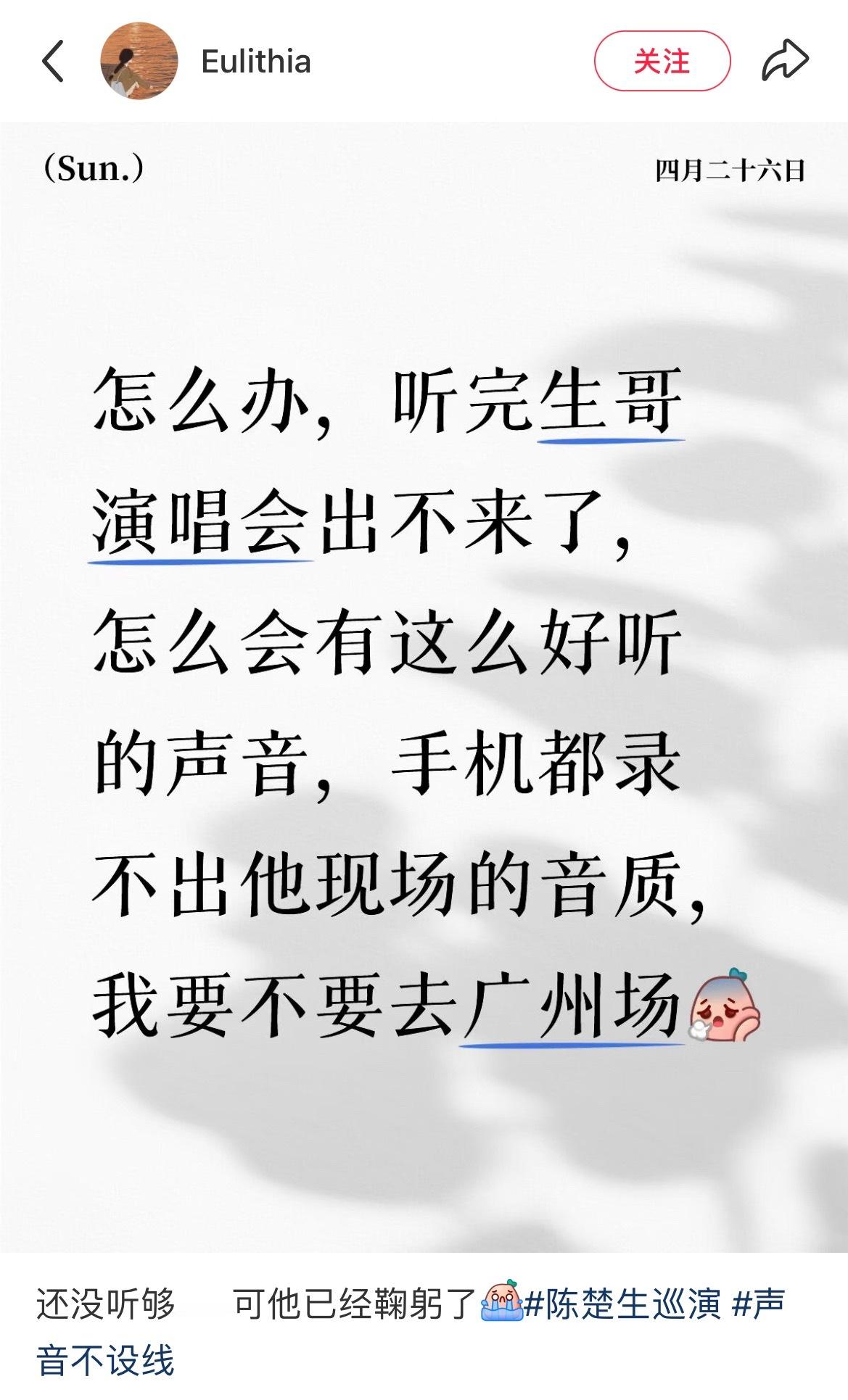【陈楚生线下只有0️⃣次和无数次】“还没听够,可他已经鞠躬了……”“听完陈楚生演唱会出不来了,怎么会有这么好听的声音,手机都录不出他现场的音质”“博爱如我第一次有了追着歌手跑的冲动”南昌也是圈粉无数的一次啊有多少亮起的红灯又会出现在下一次的现场呢?