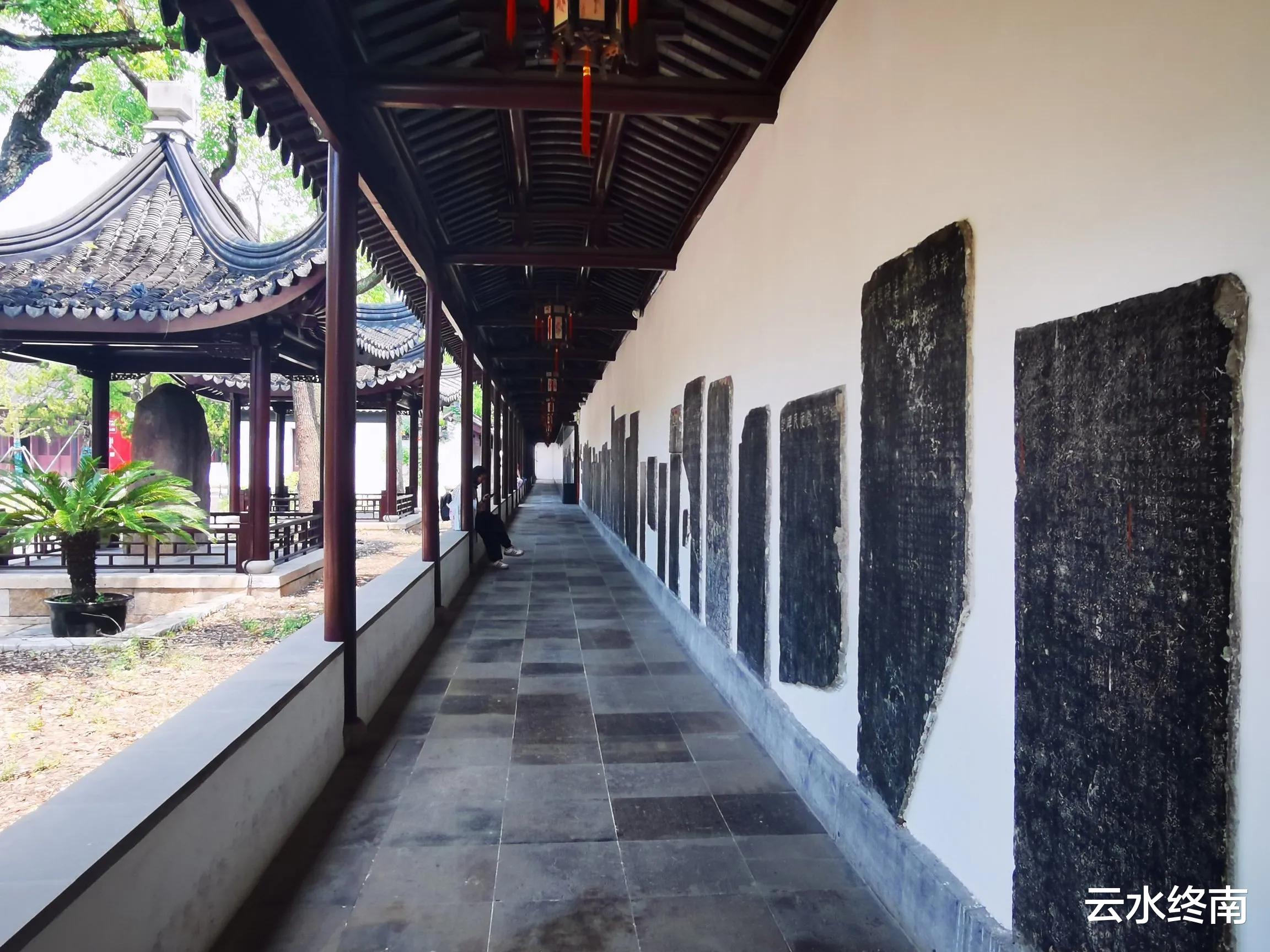 除此外,这里四面墙上都镶嵌着3000多块石刻,包括陆机、黄庭坚、苏洵、苏轼、文天祥、文征明等名家的手迹或诗碑,以孔子、儒学、苏州经济、历代书法等主题分别陈列,1985年起辟为苏州碑刻博物馆。