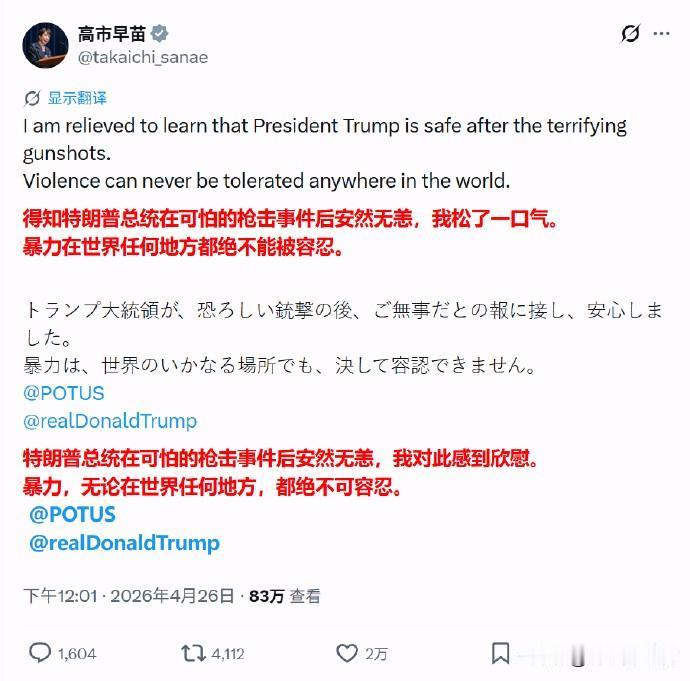 而日本首相高市早苗事发后,也发文表示“得知特朗普总统在可怕的枪击事件后安然无恙,我松了一口气。暴力在世界任何地方都绝不能被容忍。”,对事件背后的美国枪支暴力乱象只字不提,谄媚姿态尽显。