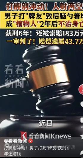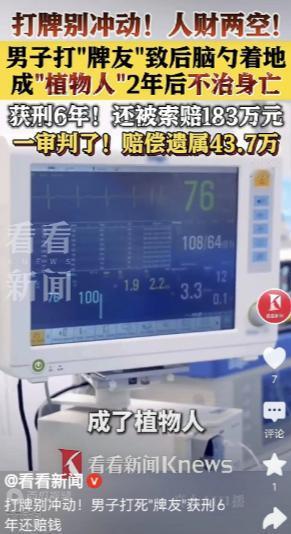 冲动的代价!4月24日,江苏台州,一男子和俩朋友打牌,不料,因为出牌,男子和朋友吵了起来,男子脾气急躁,一巴掌打到朋友脸上,朋友往后一仰,后脑勺摔到了地上,朋友被送进医院,一躺74天,医疗费20.2万,男子垫付了1.2万,可不幸的是,朋友颅脑损伤,成了植物人,男子以故意伤害罪被判刑6年,不料,2年后朋友去世,家属告到法院,向男子和另一个朋友索赔183万,法院判了!(文中人物均为化名)