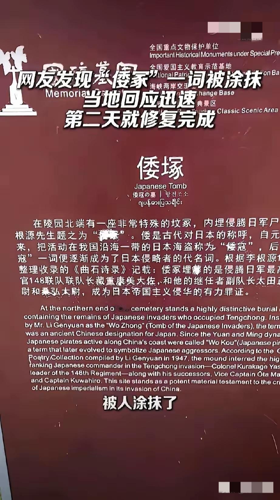 云南腾冲国殇墓园的“倭塚”石碑,“倭”字被凿掉引发众怒。当地文旅部门迅速将字补回
