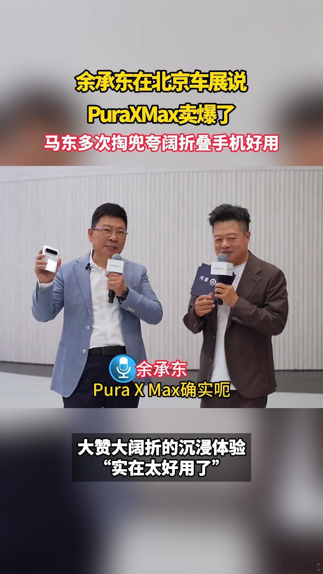余承东在北京车展说PuraXMax卖爆了余承东在车展现场透露,刚上市的华为Pura X Max开售就卖爆了!目前机器更是一机难求,牛哥也没没到!。马东多次掏兜夸阔折叠手机好用