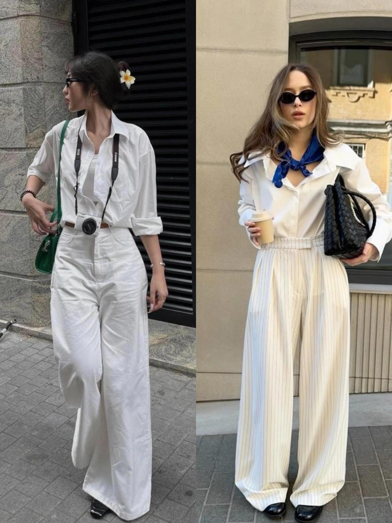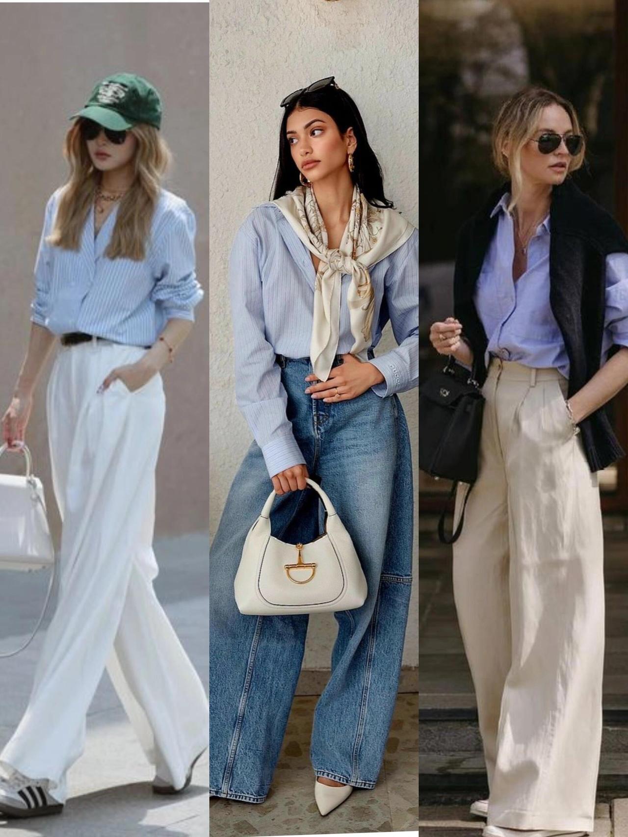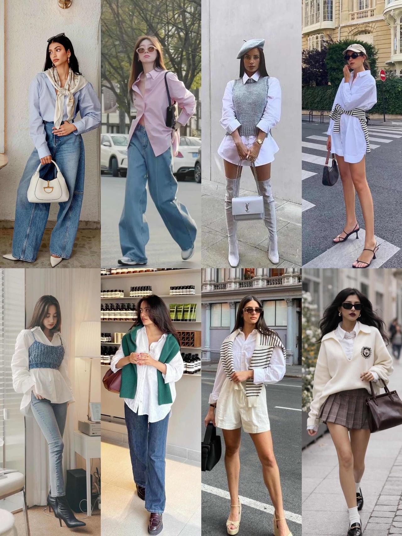 衬衫单穿配高腰裤,塞一半下摆利落显高,通勤温柔干练;叠穿马甲或解开扣子敞开,早秋慵懒松弛