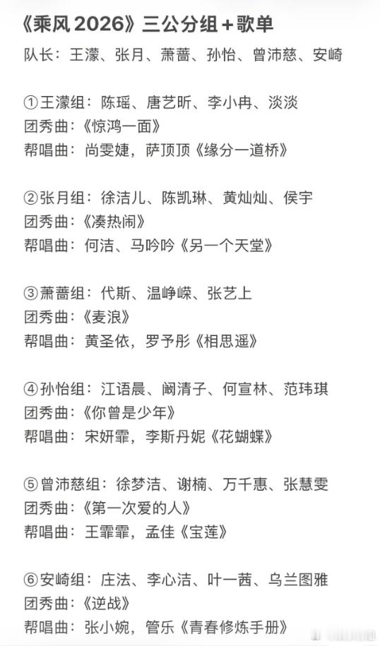 乘风2026三公淘汰四位姐姐网传乘风2026三公赛制将会淘汰四位姐姐,上半场是团秀,下半场帮帮唱,第1名和第2名全员安全,第3名至第6名则每团淘汰一名姐姐。乘风2026春日心动放映季
