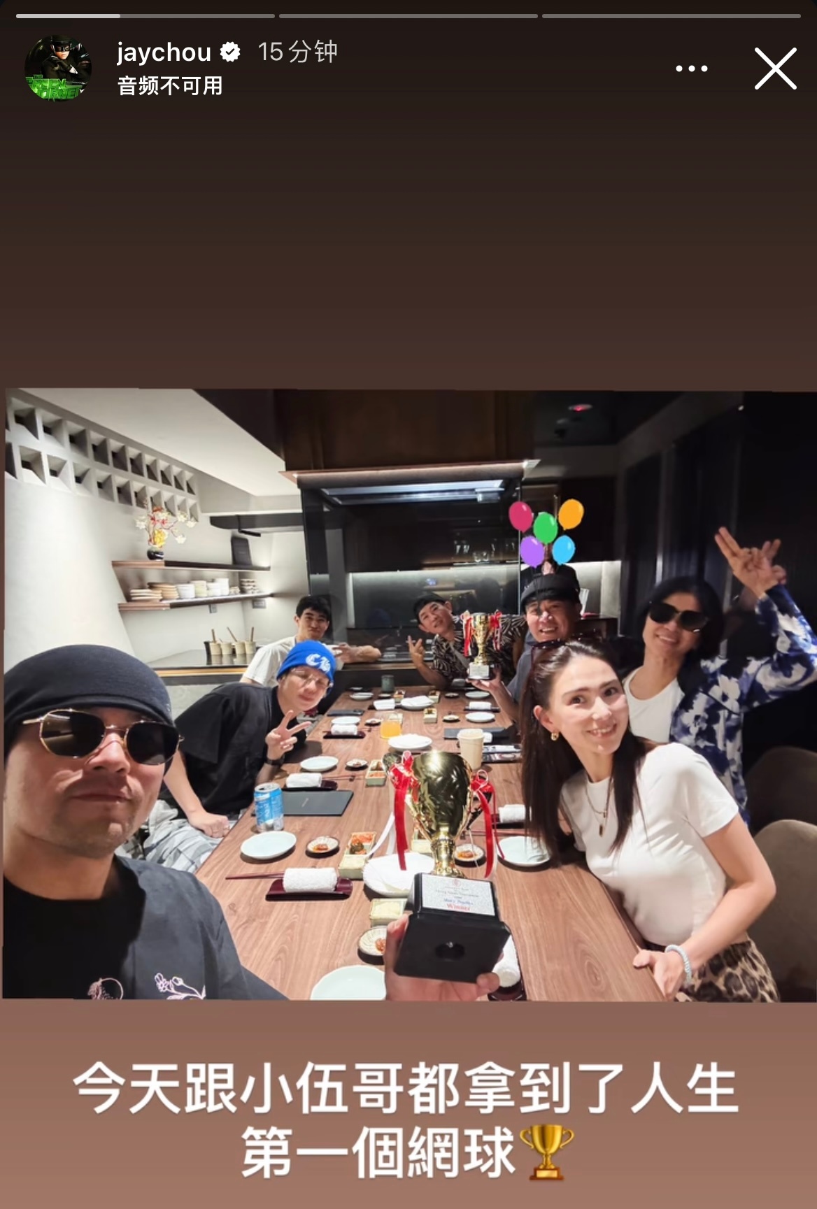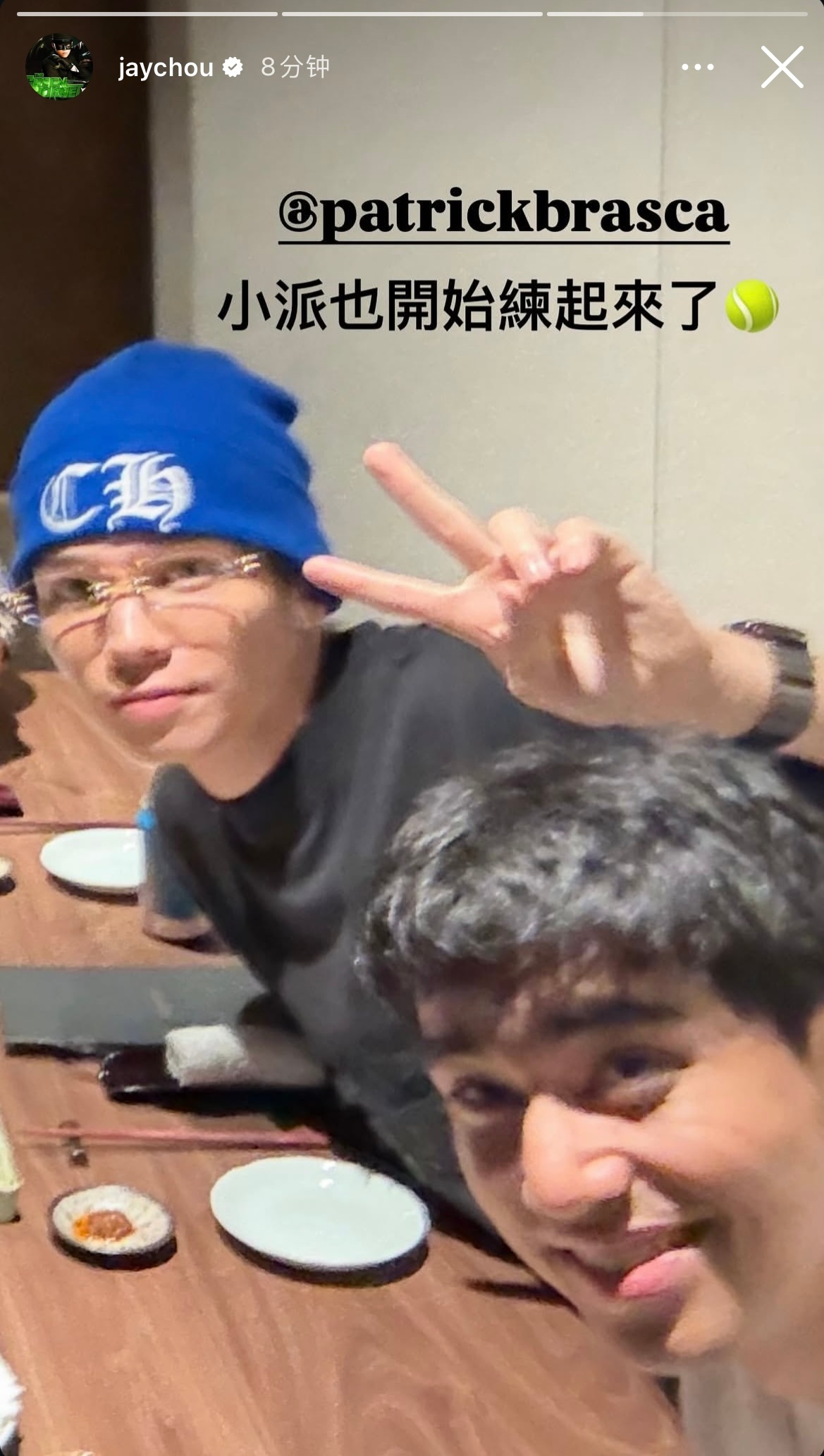 周杰伦更新动态:今天跟小伍哥都拿到了人生第一個網球🏆 小派也開始練起來了🎾