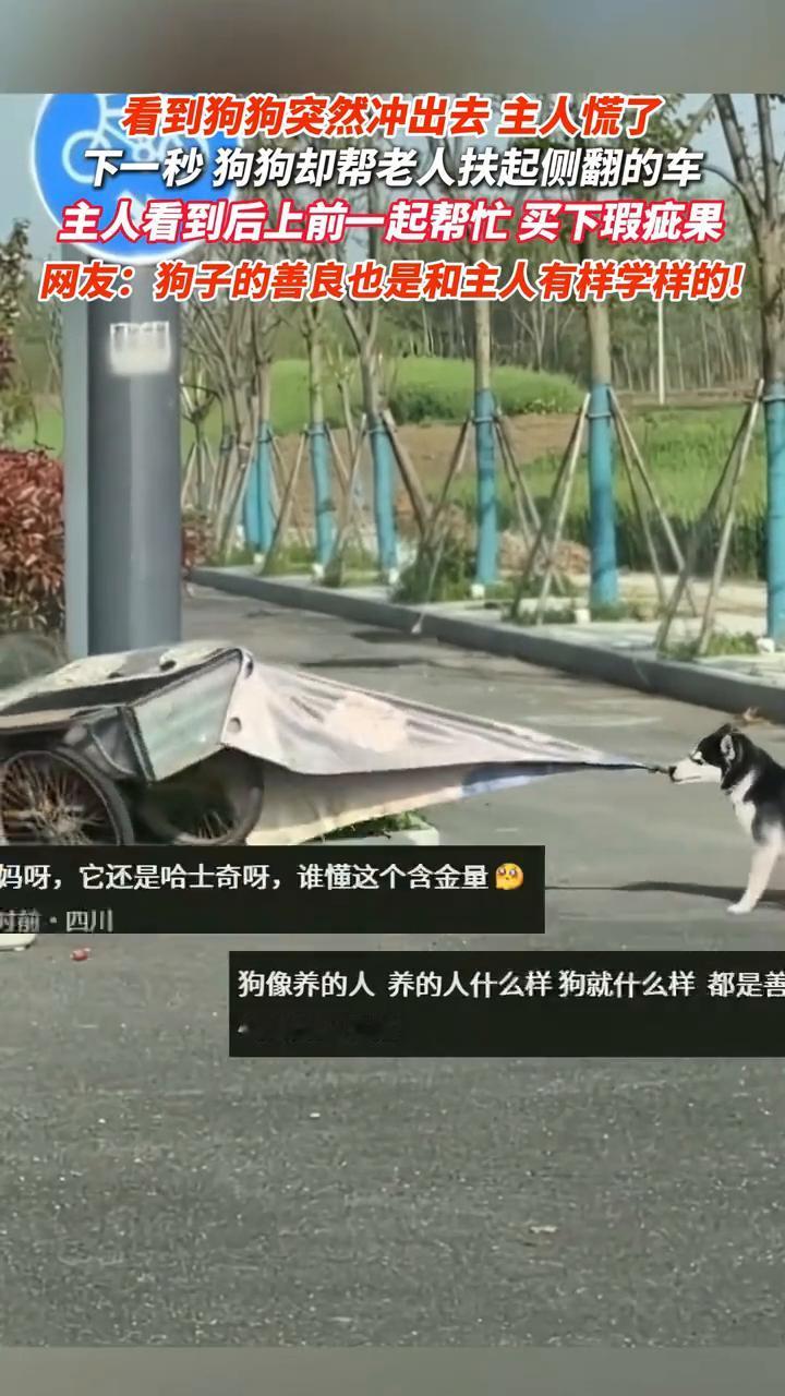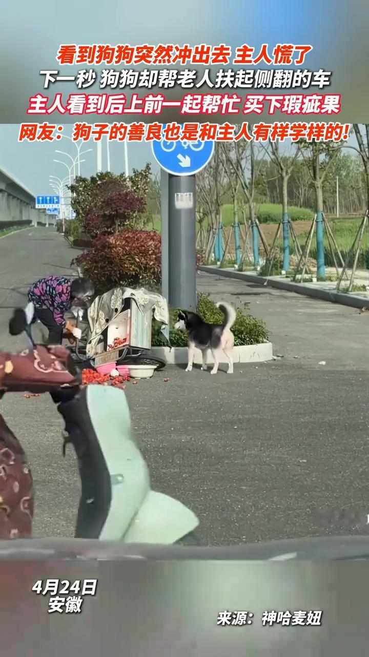 看到狗狗突然冲出去主人慌了,下一秒狗狗却帮老人扶起侧翻的车,主人看到后上前一起帮忙买下瑕疵果。