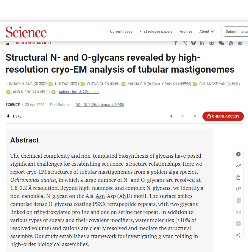 就以颜宁刚发的这个《科学》文章《Structural N- and O-glycans revealed by high-resolution cryo-EM analysis of tubular mastigonemes》为例。这是一篇糖质(glycan)结构生物学文章,讲的就是“结构”,和AlphaFold预测的“三维结构”,研究的一个东西。