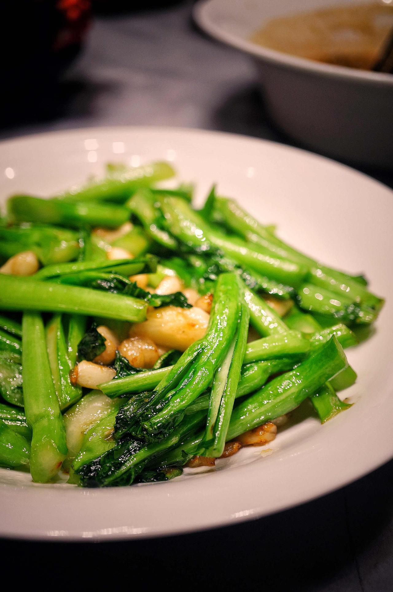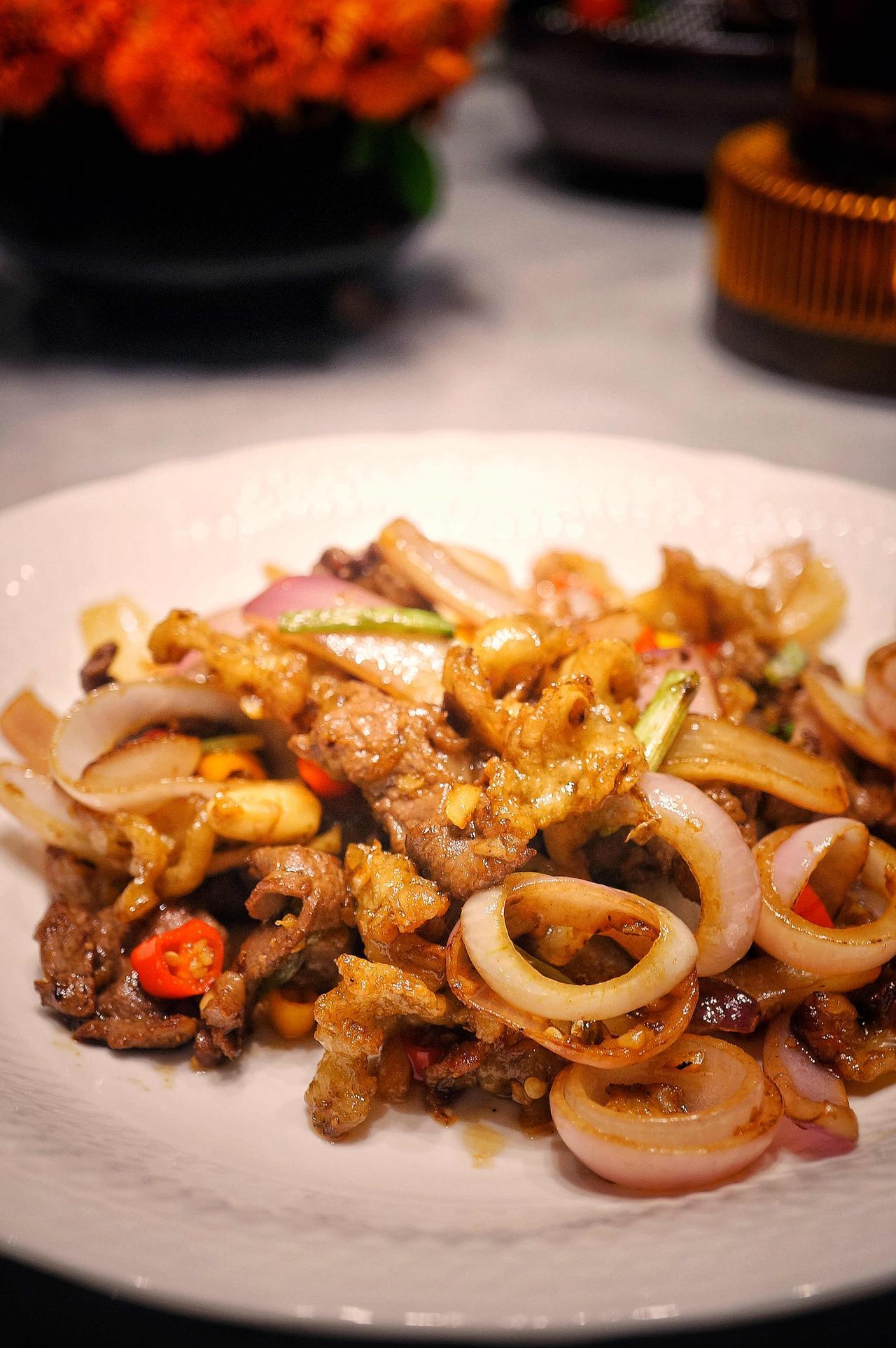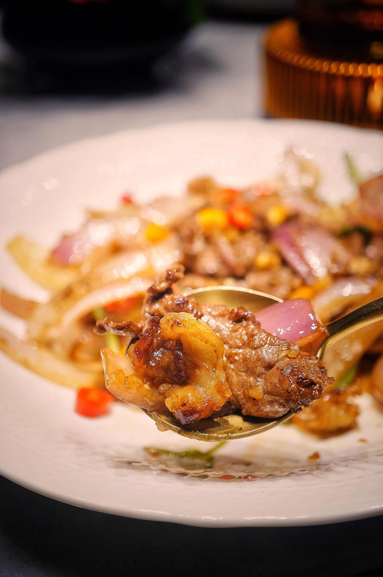 那天我点了他最拿手的吊龙炒胸口捞。吊龙嫩滑带韧,胸口捞那片雪白的牛胸油,被炒到微卷、脆而不腻。没有嫩肉粉,没有厚芡,盘底不见油。一口下去,牛油的香气在嘴里炸开,干干净净的,是肉本来的味道。