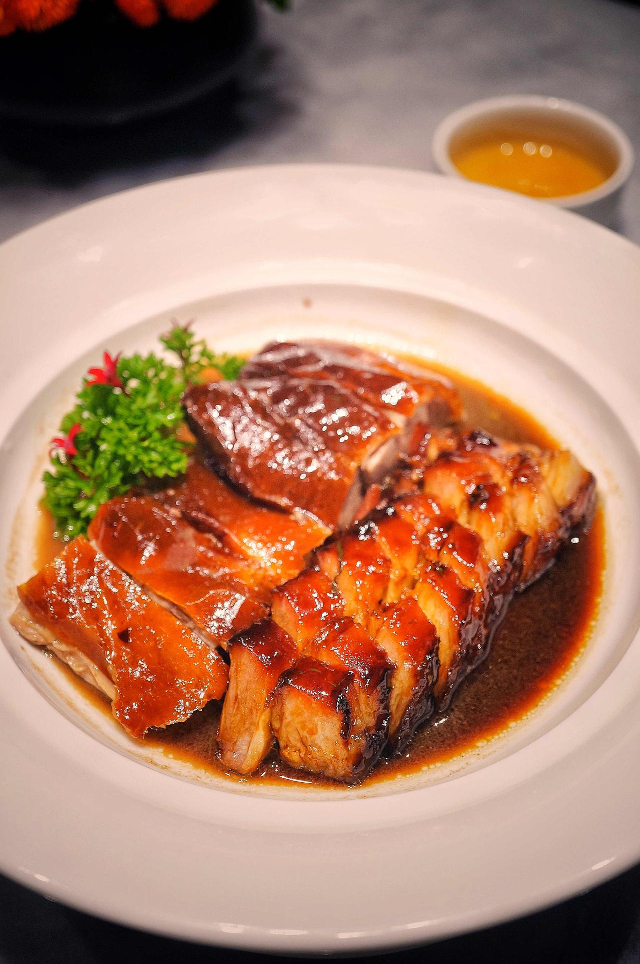 烧味双拼里的烧鸭不淋油,出炉皮脆如纸,咬下去“咔”一声,肉汁渗出。叉烧用的是金华两头乌,肥瘦相间,蜜汁焦边微微发亮,肉香纯正。