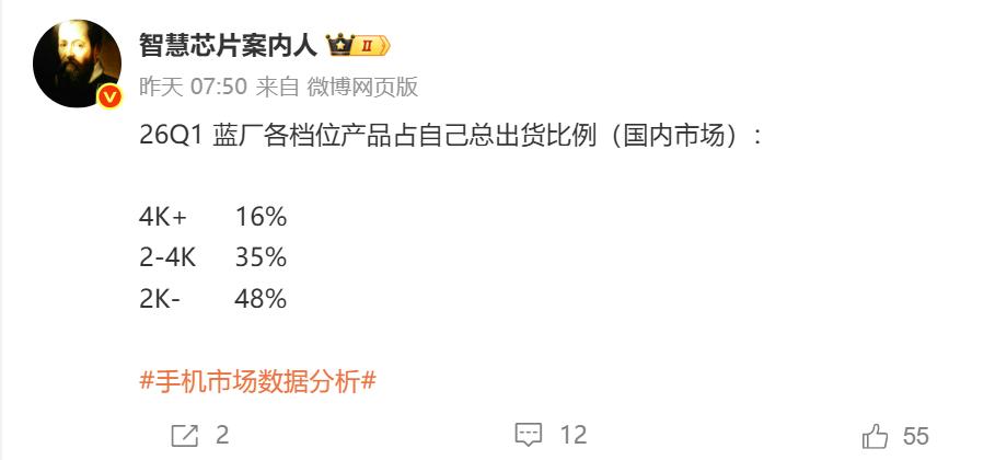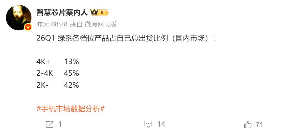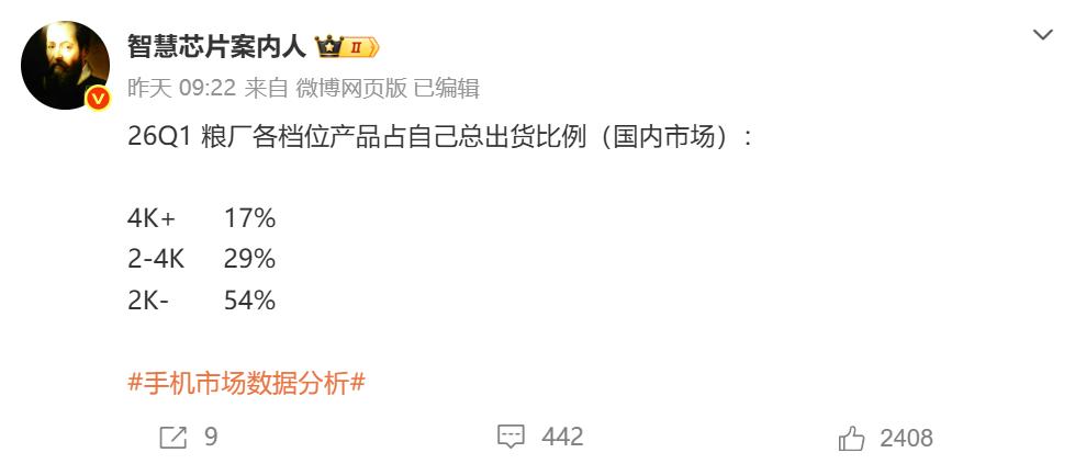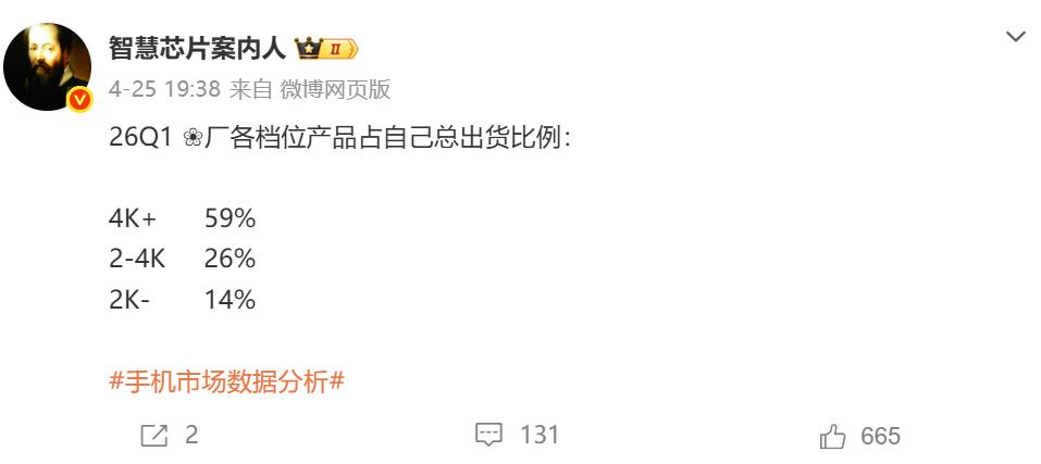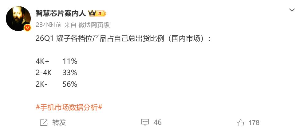 2026年Q1国内手机市场,高端占比为约37%,我米连平均值一半都没达到,好意思说自己高端成了?这就好比一个班的平均分是80分,某学生只考了30几分,然后对外大吹自己的是优等生,这逻辑简神了。