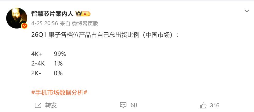 高端手机占比反映出品牌溢价能力与技术积累的深层差距,根据第三方博主提供的数据,2026年Q1国内高端手机市场,苹果高端占比为99%。华为59%,安卓4大品牌的占比均低于20%,我米的占比仅为17%。