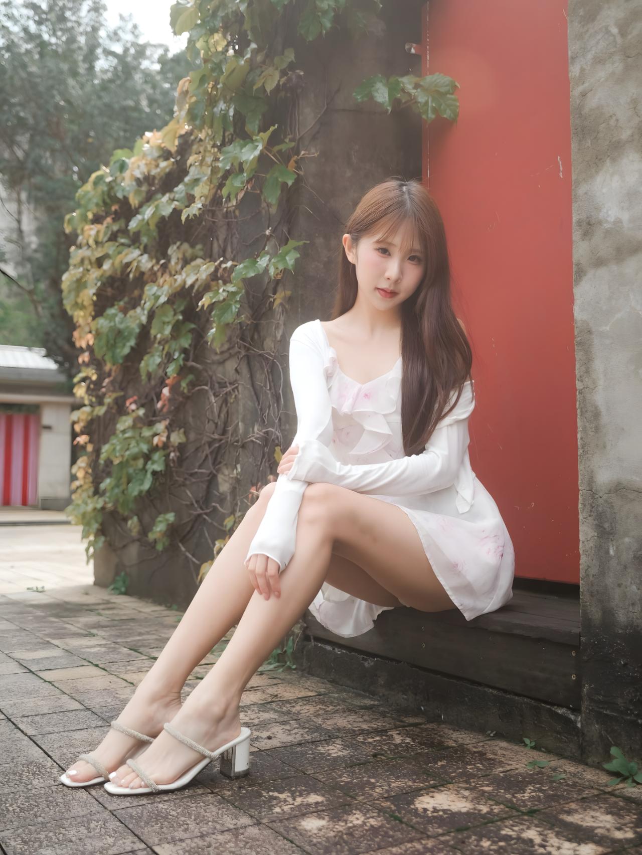 春日生活打卡季长发飘飘白衣少女,潇洒站立,红门绿植掩映,笑对人生。