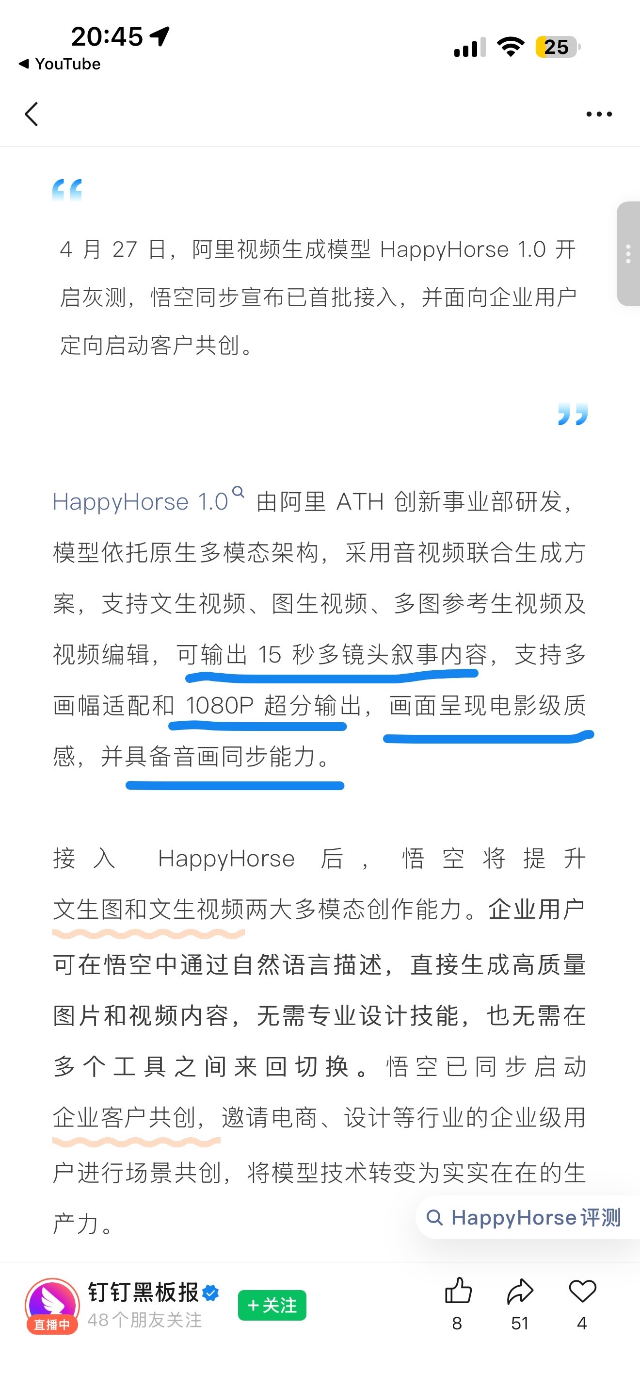 刚刚有厂友在群里发了一张截图,说他们用的悟空在「设置」里已经能选HappyHorse1.0模型了。因为今天HappyHorse 1.0 已经开启灰测,群里蹲着等的人不少。可厂哥翻了半天…哪儿呢?没看着啊?!一聊才知道,这波是企业级灰度,只对参与「客户共创」的企业用户开放。个人版暂时还没上。感觉这神秘感也是拉足了个人到底什么时候上啊?找悟空的厂友问了问,他们说这波企业用户接入后,一句话就能出图出视频,以后就不用在各种工具之间来回切换。进度上,内部目前正在跟电商、设计行业优先共创,个人版应该很快了。
