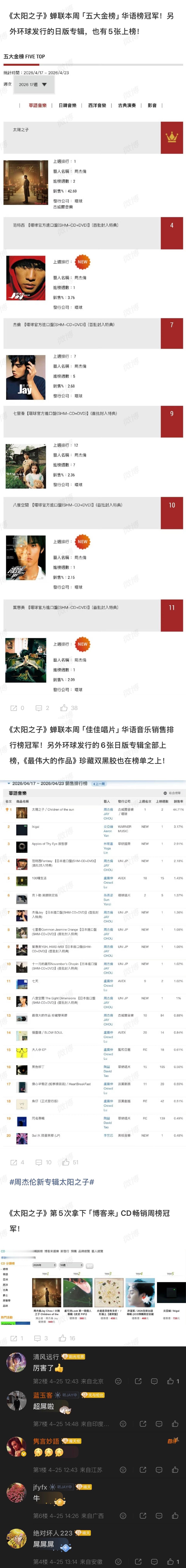周杰伦 《太阳之子》数字专辑销售额突破1.3亿 蝉联本周「五大金榜」华语榜冠军 日版也有5张上榜 5次拿下「博客来」CD畅销周榜冠军 蝉联本周「佳佳唱片」华语音乐销售榜冠军 6张日版全部上榜 KKBOX TW新歌排行榜前20 继续横扫前12名 已横扫4周 Spotify全球播放量最高的100首中文歌曲 周杰伦19首断层第1