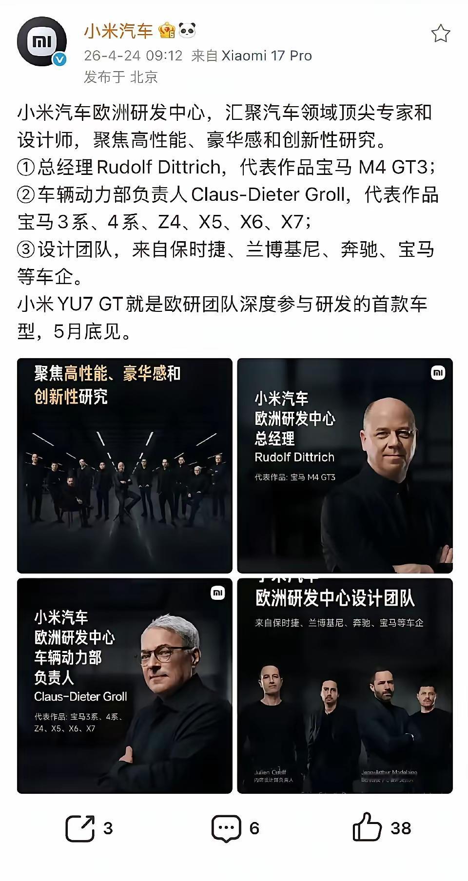简直有点不可思议,当年设计出比亚迪F3、哈弗H6,吉利博越车型,现任小米集团副总裁,首席技术官的胡峥楠(原吉利汽车研究院院长),现在管理着小米汽车欧洲研发中心的负责人及一众工程师。然后耐人寻味的地方来了,整个小米汽车欧洲研发中心的团队人员全部来自于奔驰、宝马、保时捷、兰博基尼等全球知名车企。