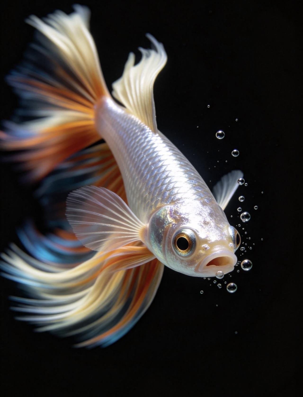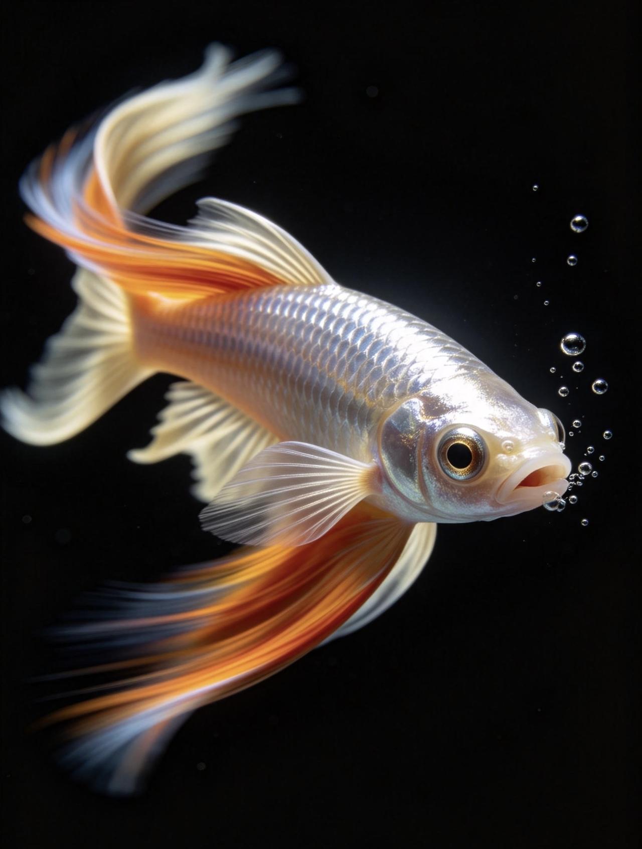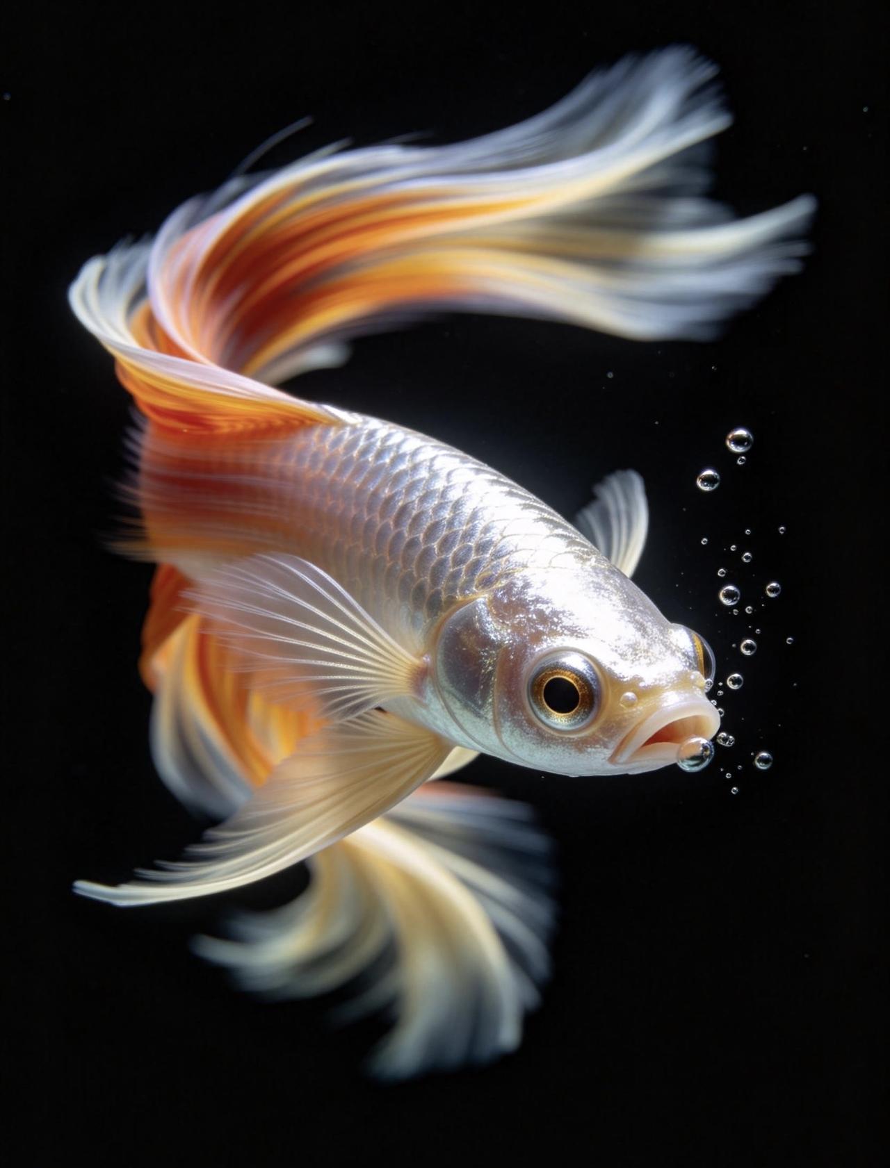 鱼鳍是半透明奶白色,整条鱼灵动又耀眼。整片画面只有鱼眼刻画得格外精致清晰,还有鱼嘴缓缓吐出几颗上浮小水泡,细节拉满。光影立体高级,色彩鲜亮浓烈,构图极简又独特,视觉冲击力十足,质感堪比电影高清特效大片。