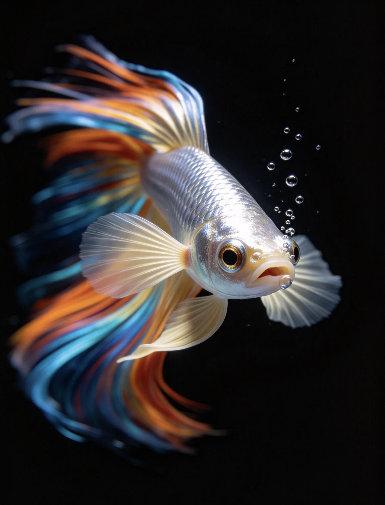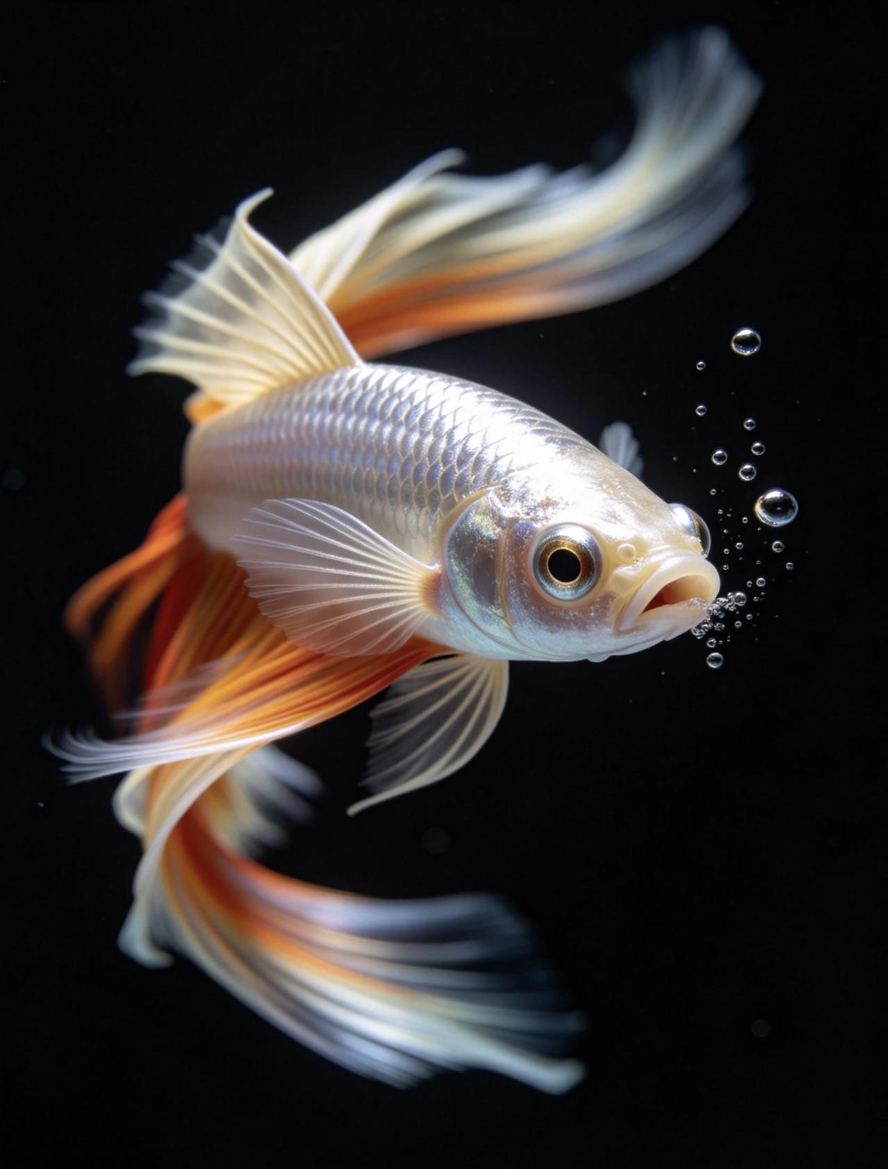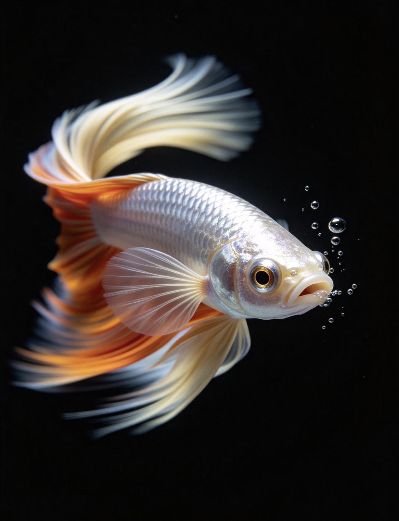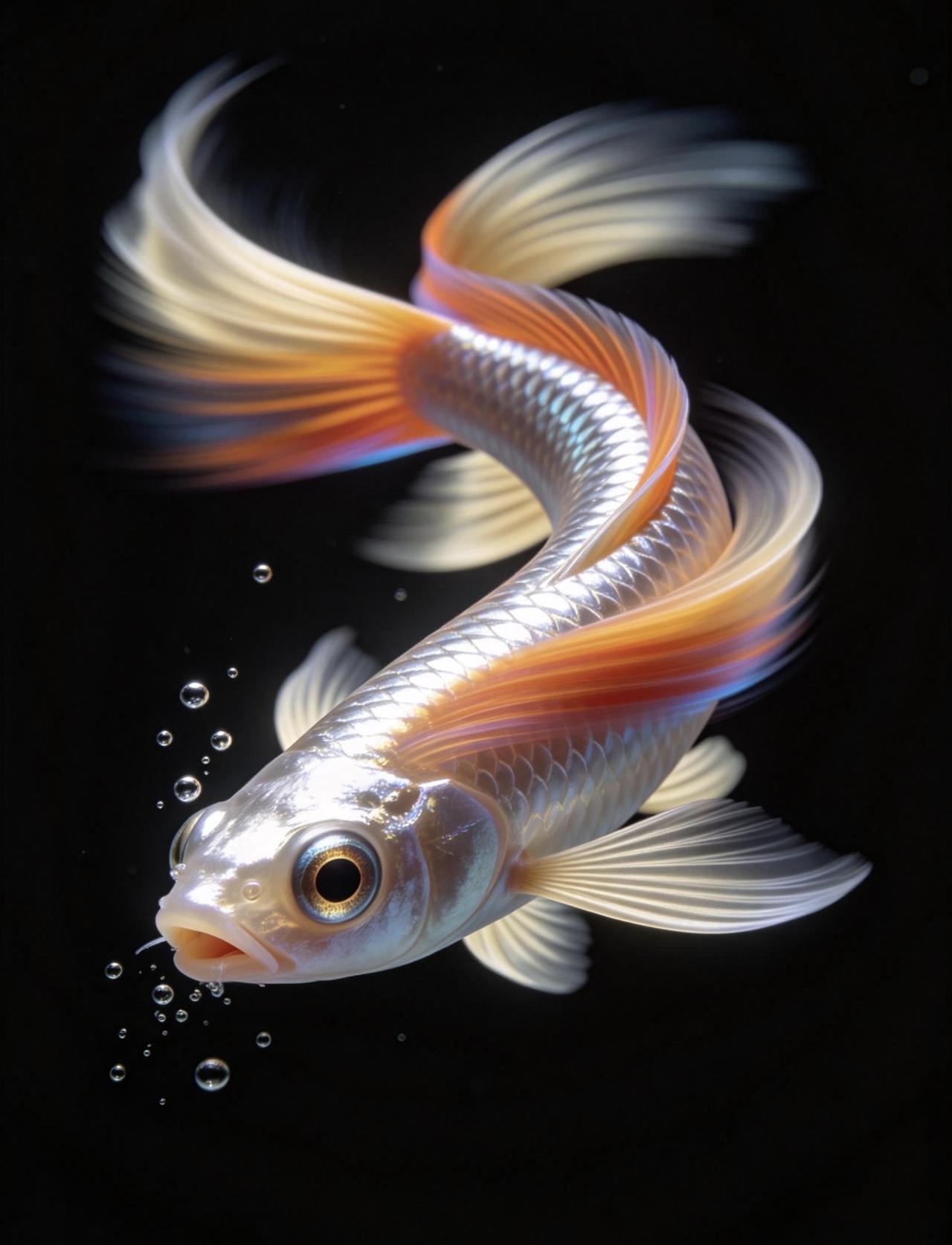 鱼鳍是半透明奶白色,整条鱼灵动又耀眼。整片画面只有鱼眼刻画得格外精致清晰,还有鱼嘴缓缓吐出几颗上浮小水泡,细节拉满。光影立体高级,色彩鲜亮浓烈,构图极简又独特,视觉冲击力十足,质感堪比电影高清特效大片。