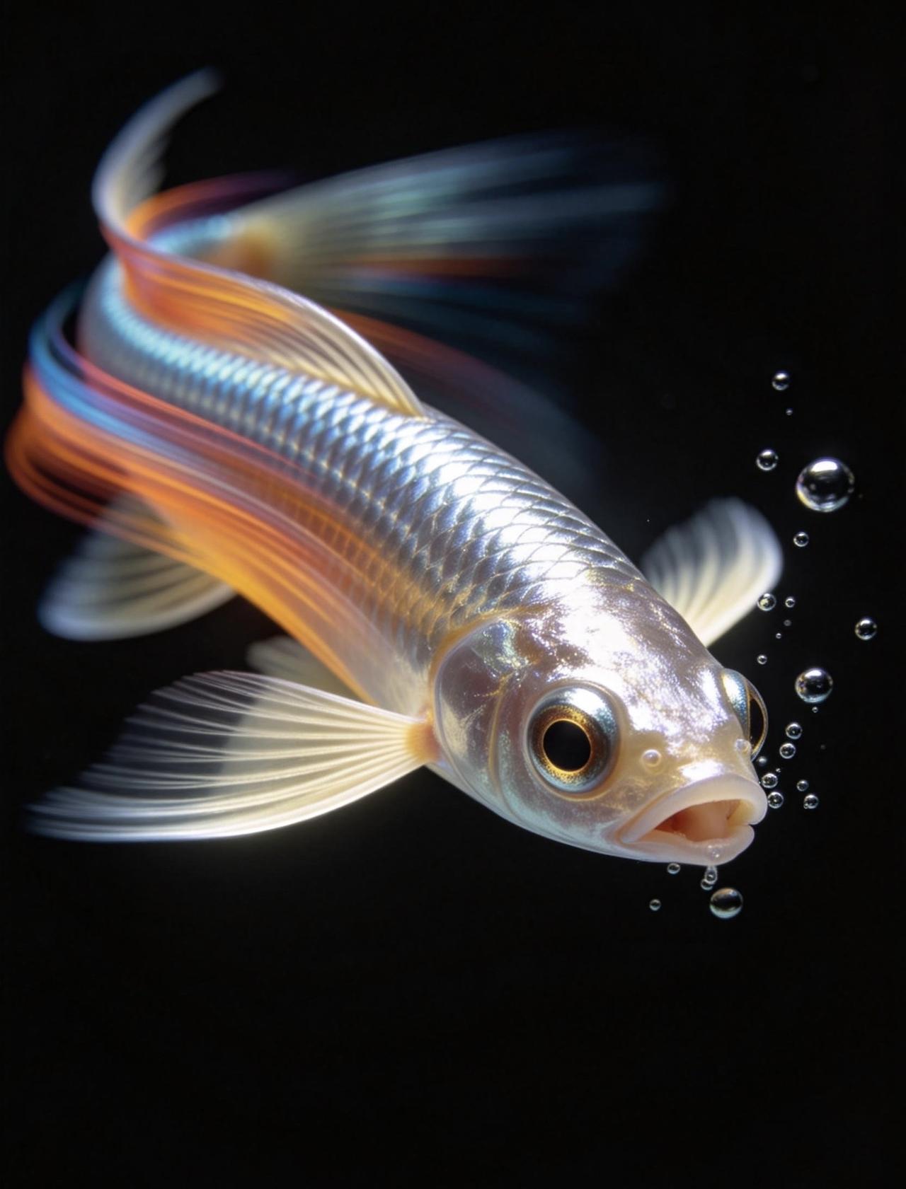 📝黑色纯底的水下画面里,亮银鳞片的盲鱼高速穿梭游动,身体晕染成高饱和的流动彩带状,鱼身带着强烈动态模糊,满是极速动感。