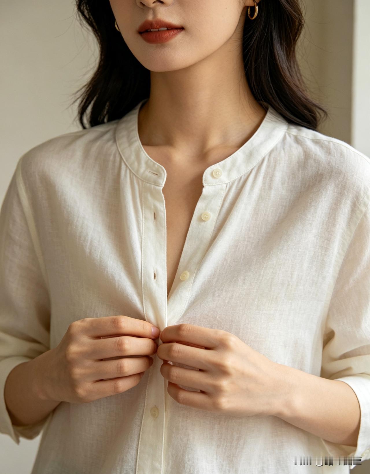 家里有圆领衫也别扔,改一下就行。 穿的时候把最上面那颗扣子解开,或者领口往后拉一拉,露出一点点锁骨就行了,三秒钟的事,一毛钱不花,跟换了件新衣服似的。
