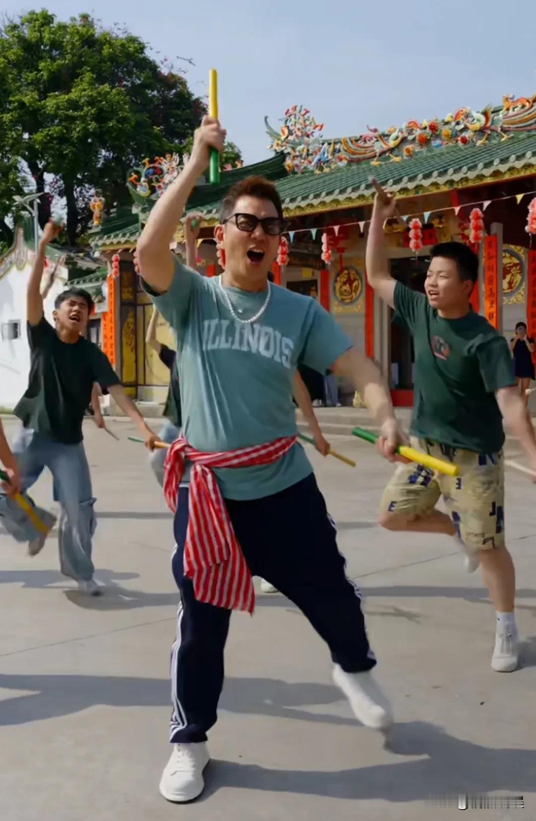 这次他来汕头开演唱会,体验了心心念念的“英歌舞”,穿着蓝色T恤配运动裤,戴着眼镜,跟着师傅们一板一眼的学着。