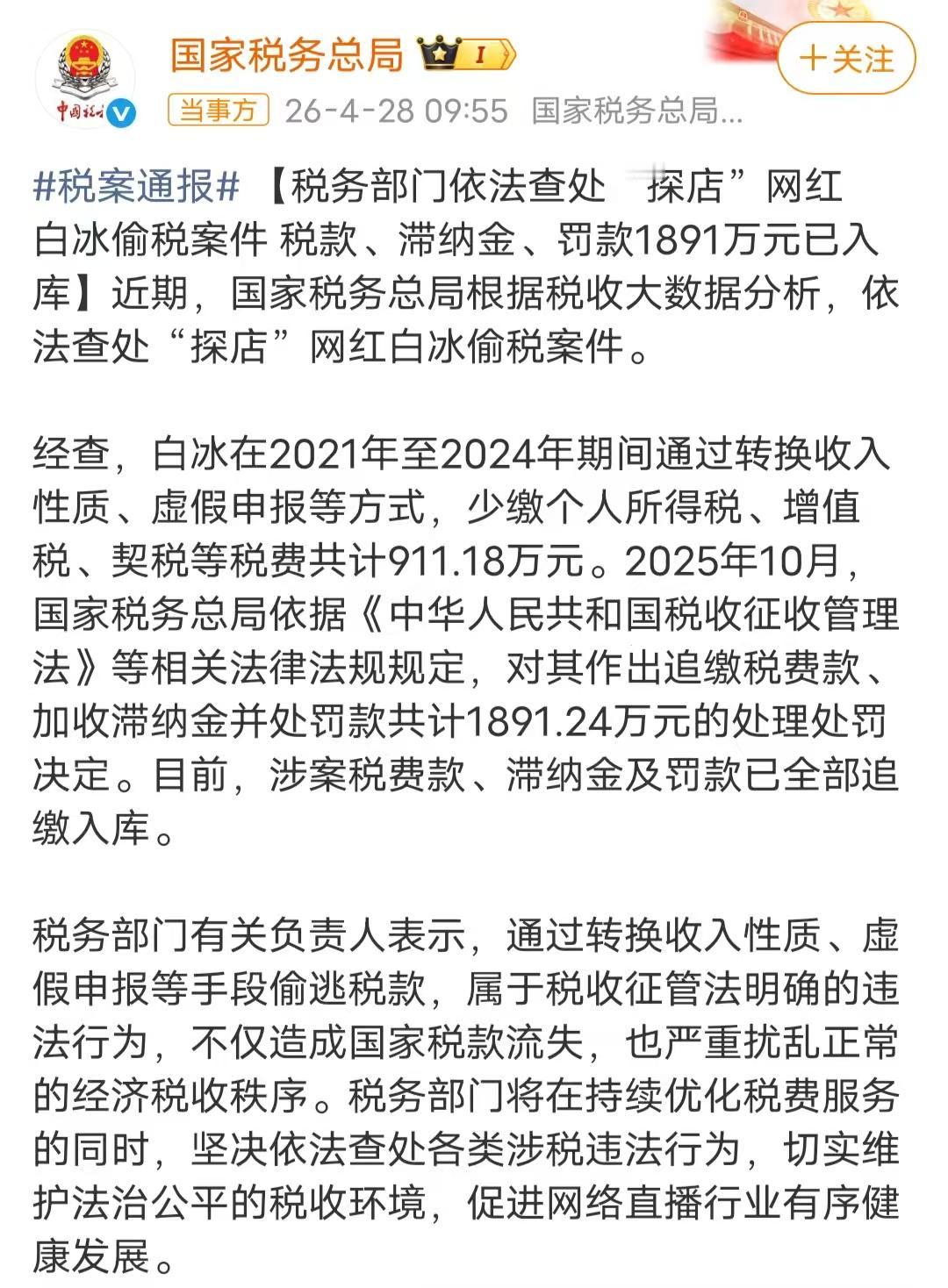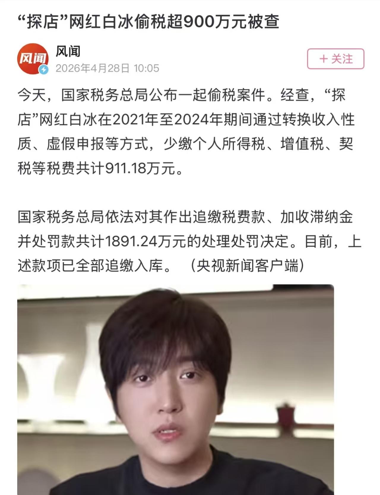 探店网红白冰翻车,通过注册空壳公司等手段,偷漏税911万。白冰偷漏税这件事,最可怕的是金额,税都要接近一千万了,他做什么能赚这么多?还有被罚1891万,能快速缴纳,他是多有钱。每次刷视频,都能看到他不计成本的消费,钱对他来说只是一个数字而已,还要偷漏税实在说不过去。