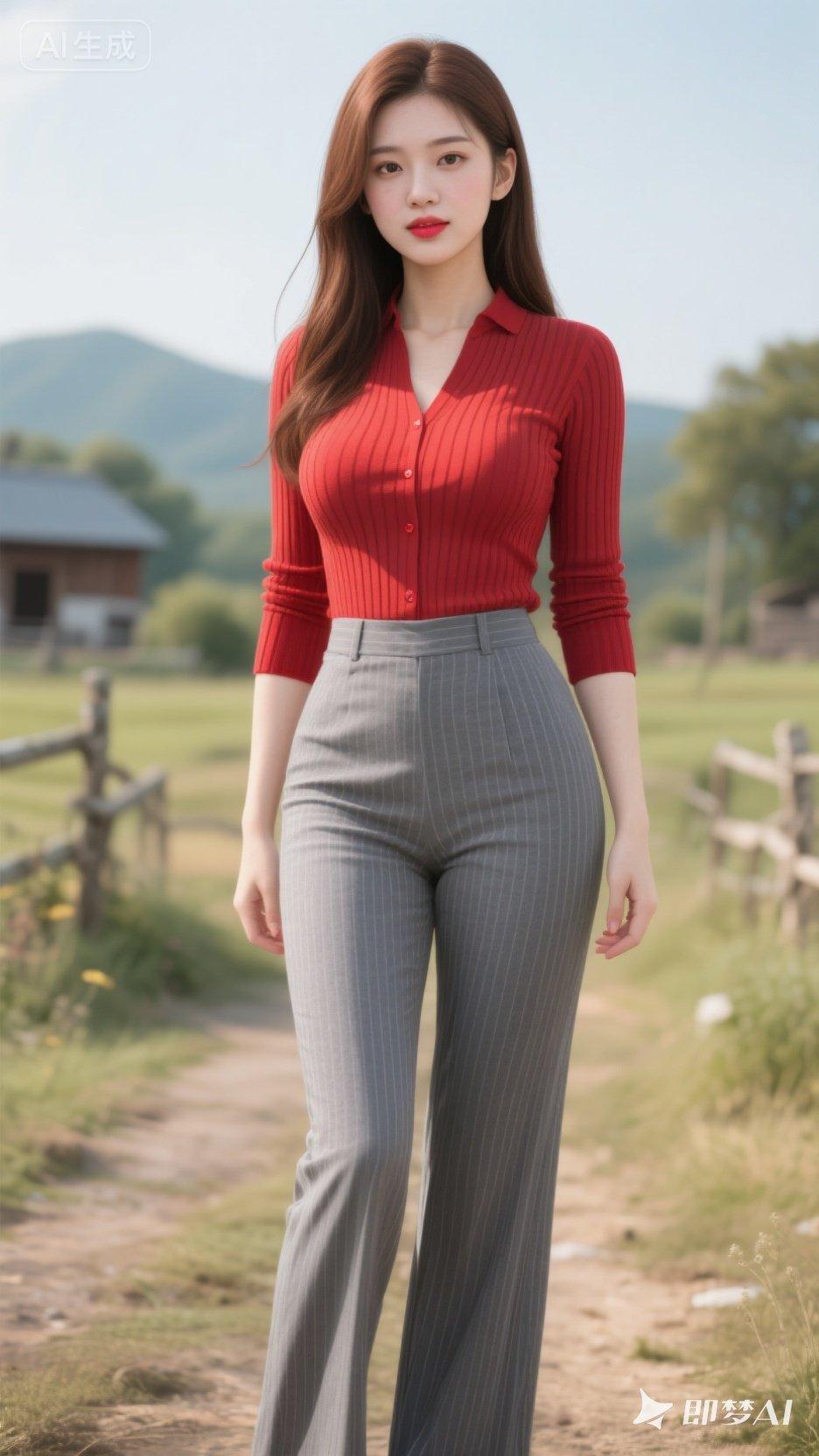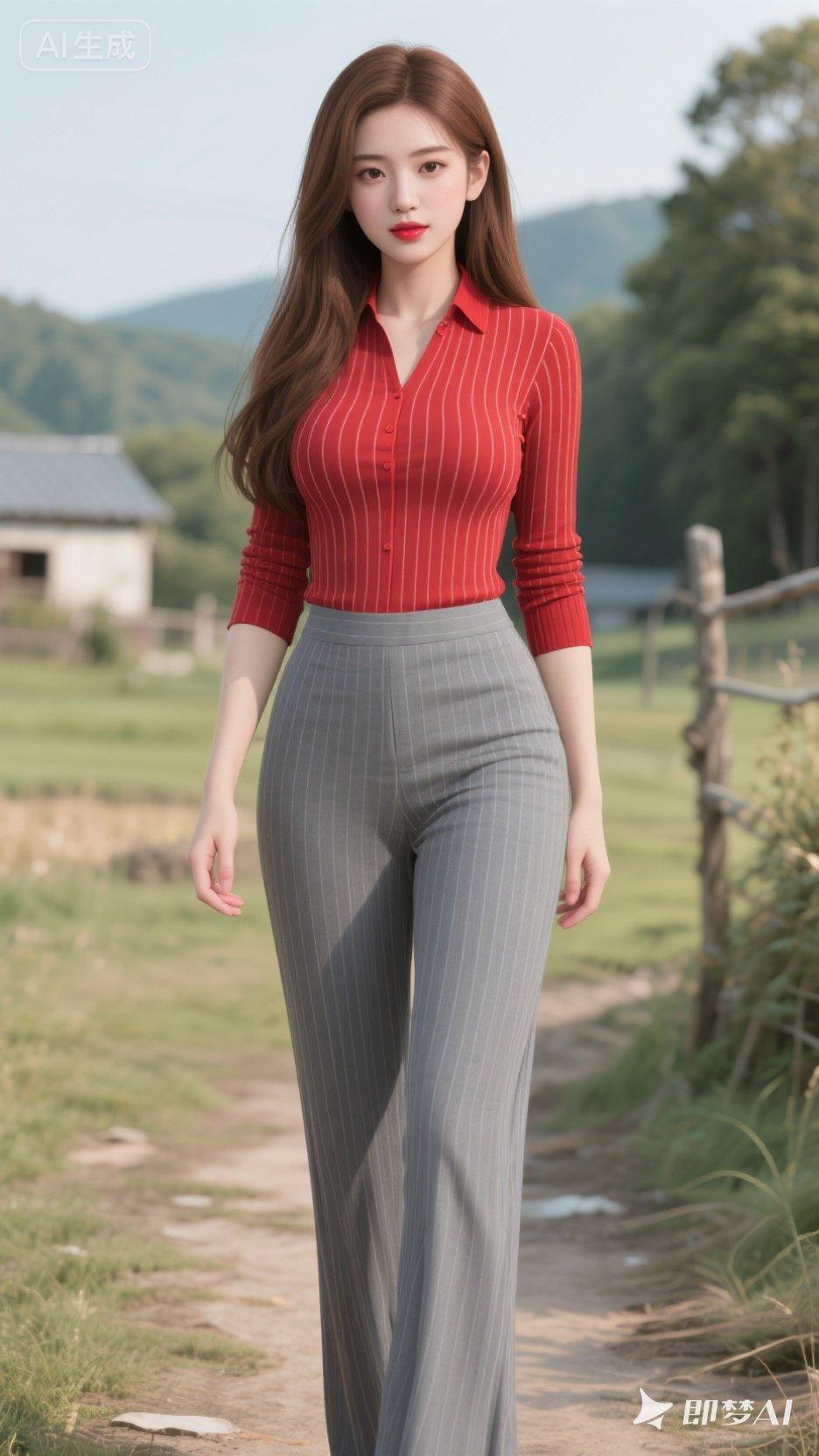 在田野间漫步,红衣与绿意相映成趣,美不胜收!