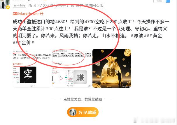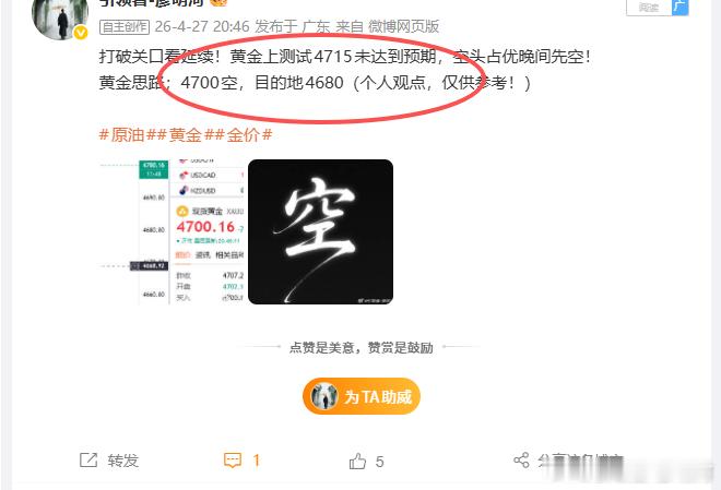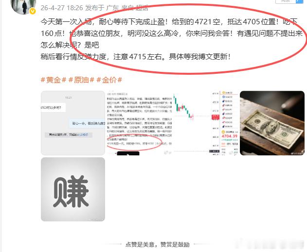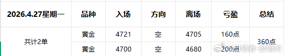 周二上午好!首先回顾一下昨日战绩!2026.4.27星期一;共计分享2单拿下360点!第一;4721空,在4705走胜160点第二;4700空。在4680走胜200点