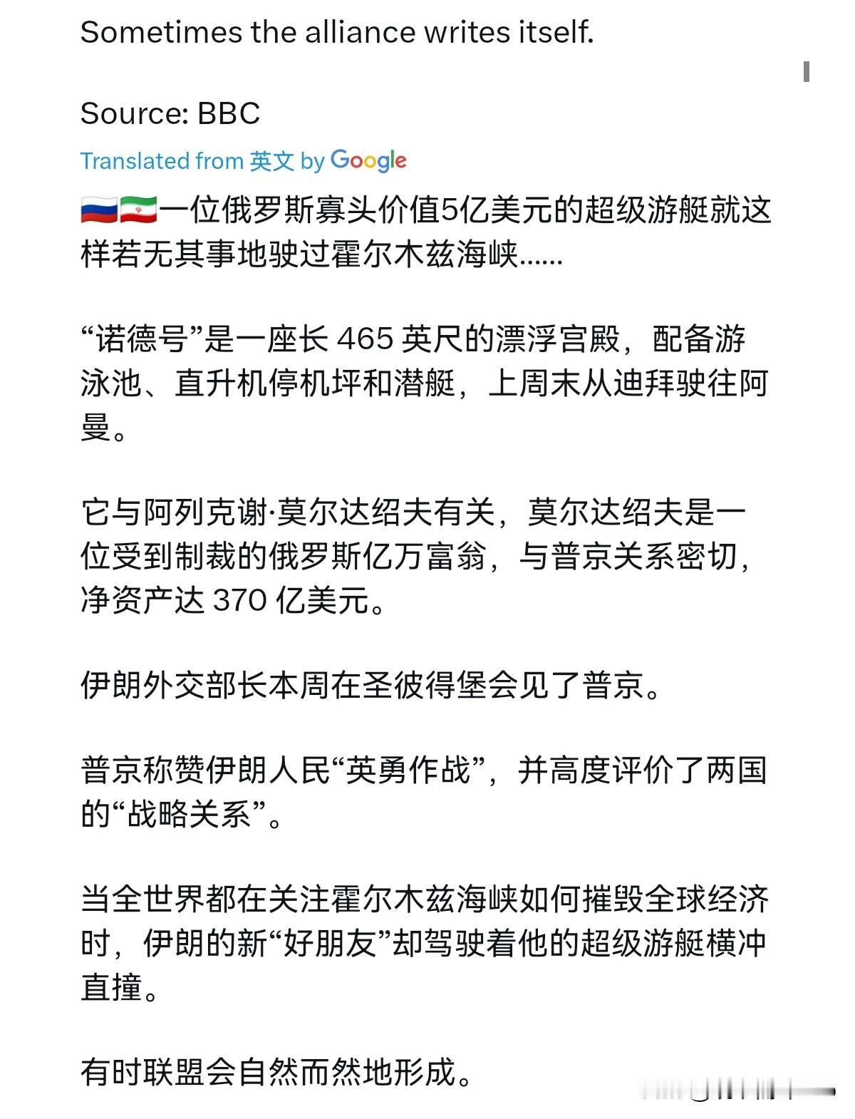 外媒称,这位遭西方制裁的俄罗斯亿万富豪与普京关系密切,个人净资产高达370亿美元。就在全世界紧盯霍尔木兹海峡危机或将重创全球经济之际,伊朗如今的核心盟友,却驾着豪华超级游艇从容穿行于此,这已然直白印证了俄伊同盟的紧密程度。要说伊朗放行俄罗斯游艇,这不让人意外。问题的关键就在于,作为在制裁名单上的游艇,美国竟然装作没有看见,竟然也选择放行了。
