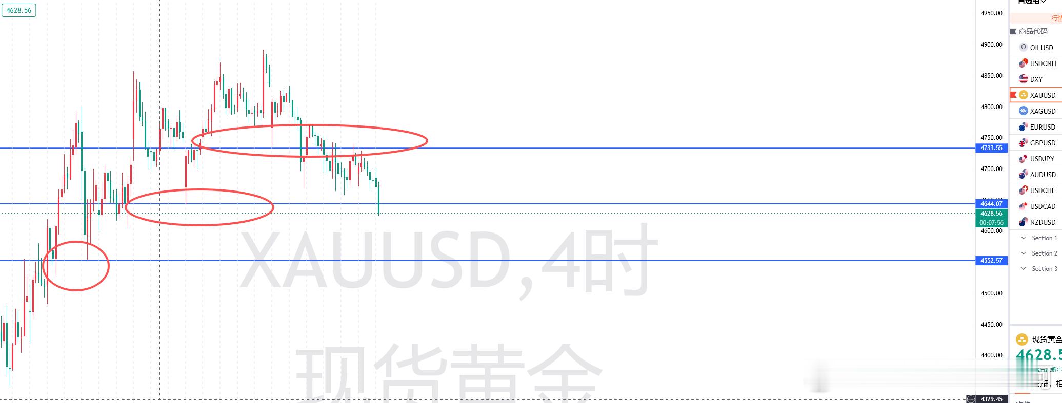 来到午间黄金一根大跌线拉出,打破的4小时重要支撑4645位置!目前顶底转换,4645成为短时间的压制,黄金下一个关键支撑在于4550位置,小时线支撑在于4600关口!提前埋伏;4645空,目的地4600(个人观点,仅供参考!)