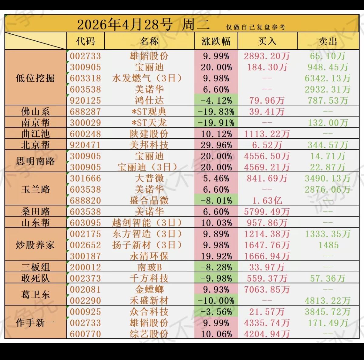 4月28日游资龙虎榜全拆解!顶级大佬真实操盘方向曝光🔥🟥顶级游资大
