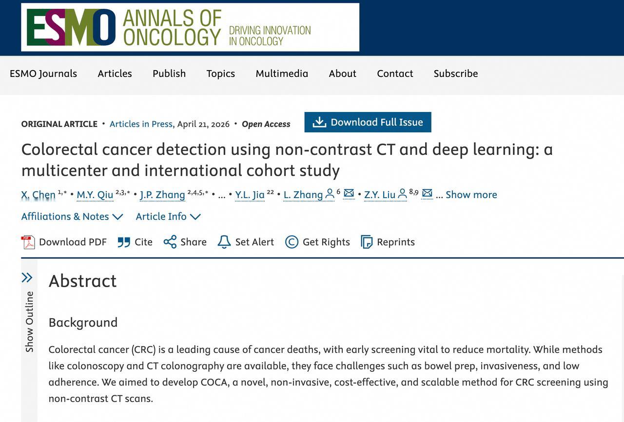 最近的消息显示,阿里达摩院已经联合广东省人民医院等机构研发出肠癌筛查AI模型DAMO COCA,这个模型在2.7万人的平扫CT影像中精准识别5例漏诊肠癌,敏感性、特异性分别达到86.6%和99.8%。
