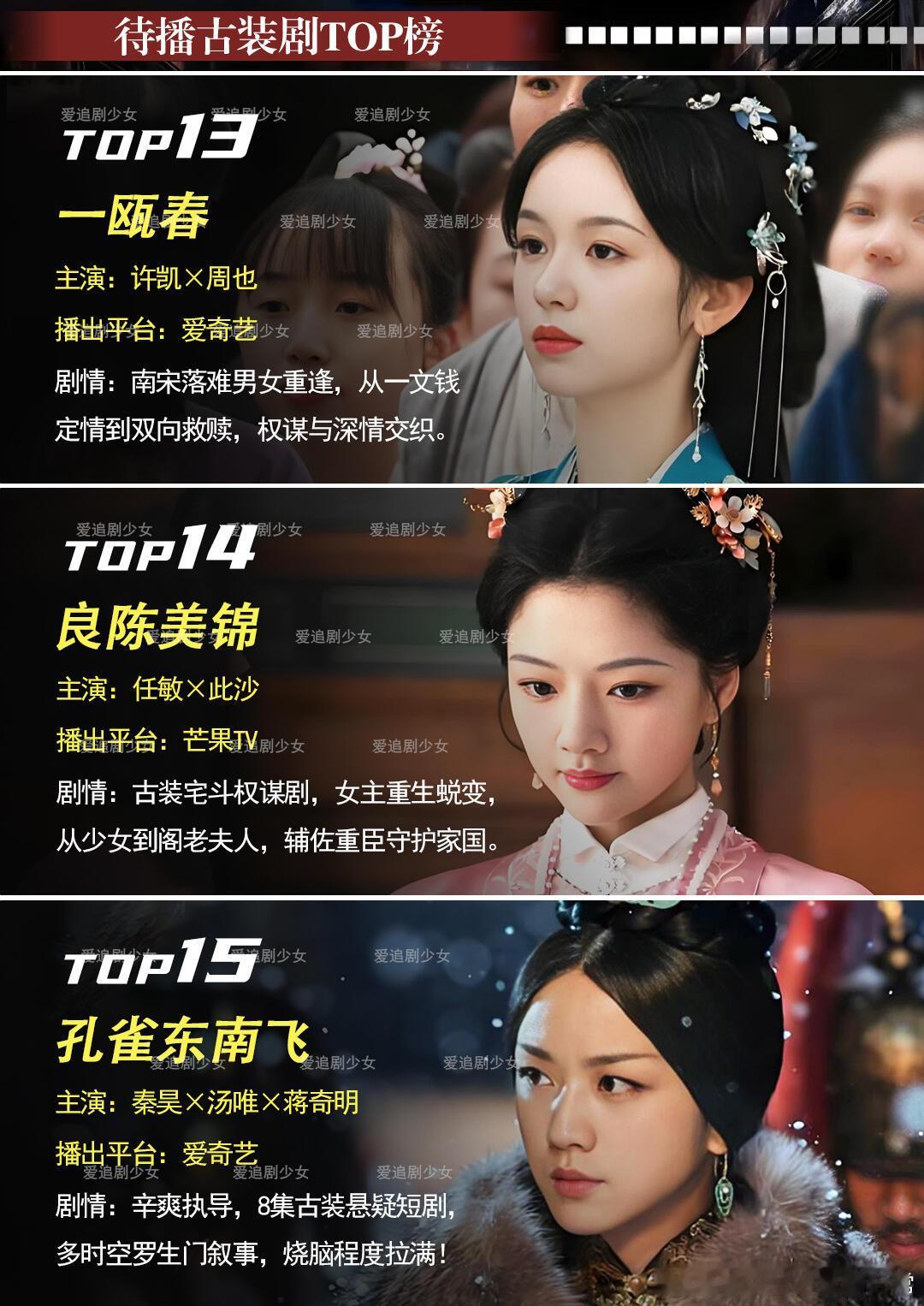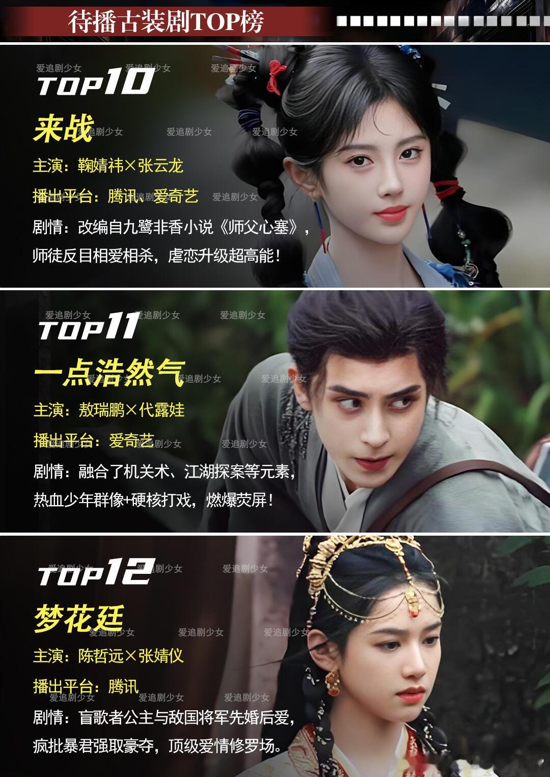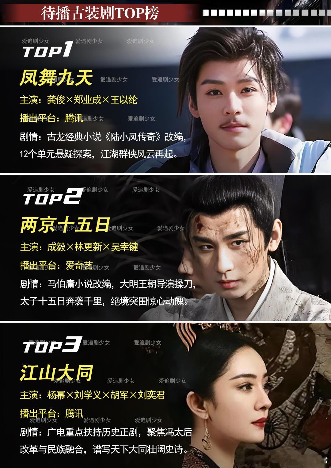 2026年待播古装剧推荐,你最想看哪一部?《凤舞九天》龚俊、郑业成《两京十五日》成毅、林更新、吴幸键、姜珮瑶《江山大同》杨幂、刘学义、胡军、刘奕君《金枝》李一桐、陈星旭《归鸾》张凌赫、林允《翘楚》陈都灵、周翊然《司宫令》丁禹兮、宋祖儿《归良辰》李昀锐、刘些宁《兰香如故》谭松韵、刘学义《来战》鞠婧祎、张云龙《一点浩然气》敖瑞鹏、代露娃《梦花廷》陈哲远、张婧仪《一瓯春》许凯、周也《良陈美锦》任敏、此沙《孔雀东南飞》秦昊、汤唯、蒋奇明