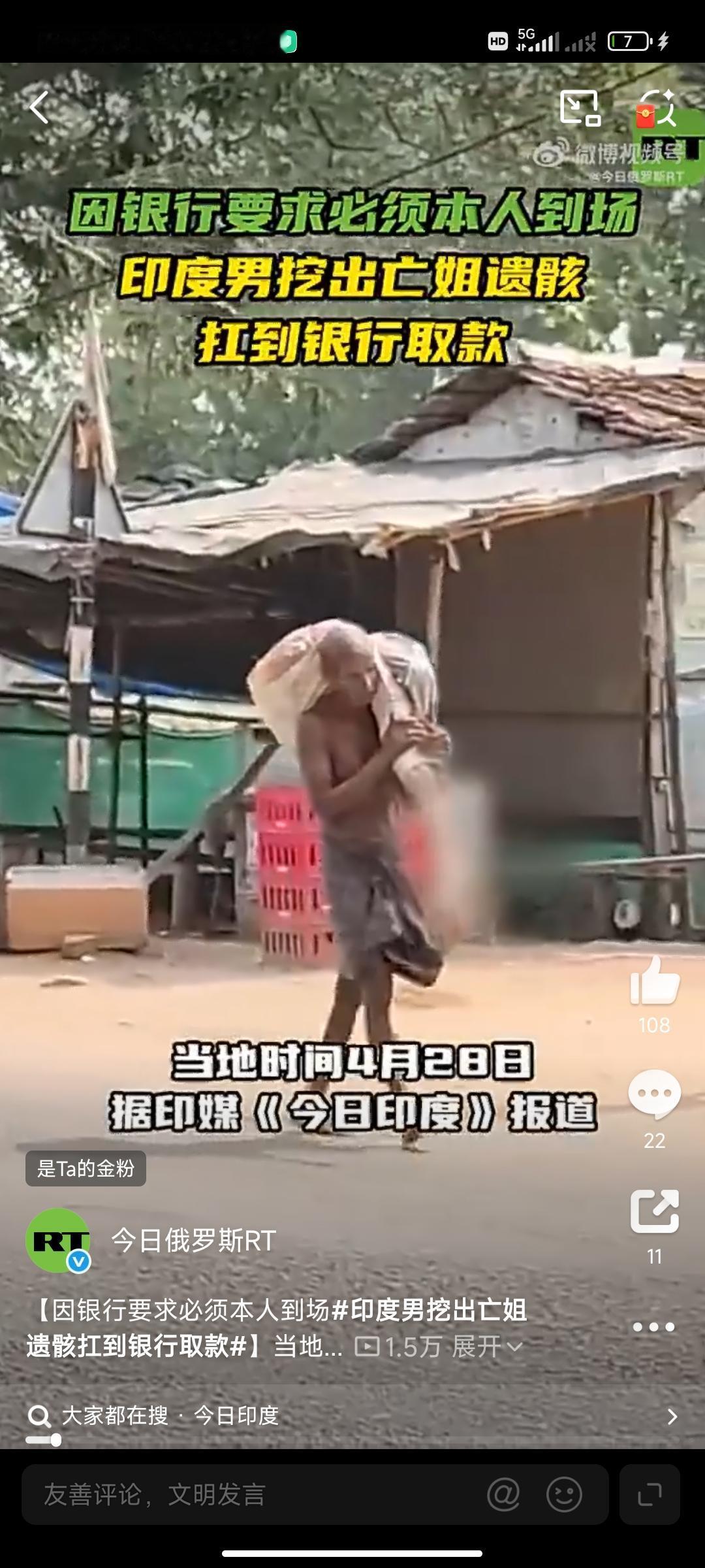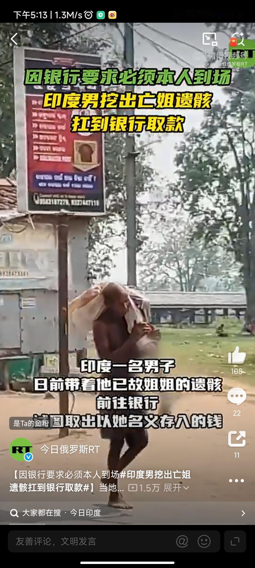 报道称,印度一名男子日前肩扛着他已故姐姐的遗骸前往银行,试图取出以她名义存入的钱。