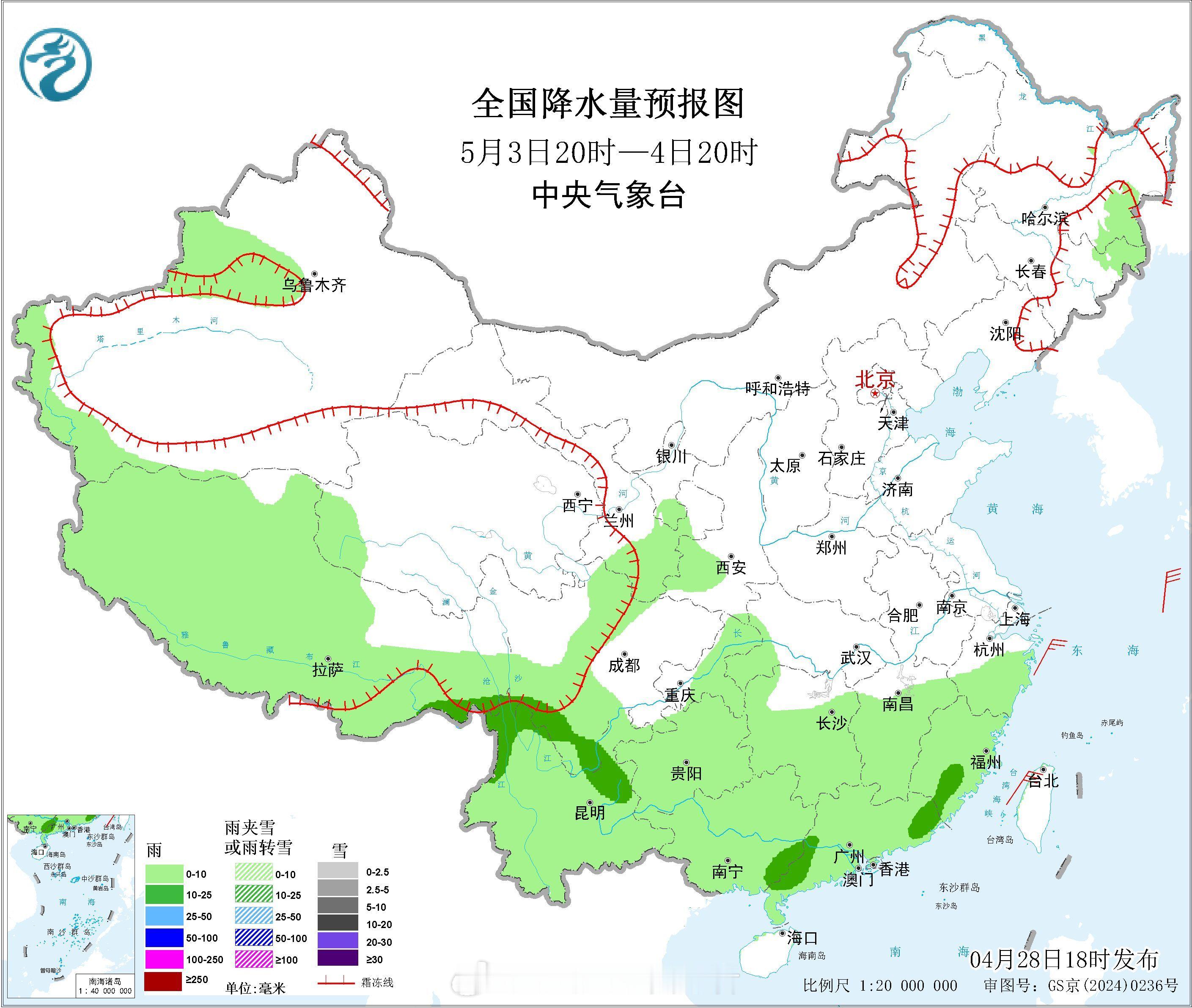 4月30日至5月3日,青藏高原、西北地区东部、黄淮南部及南方地区自西向东有大范围降雨天气过程,其中江南、华南中北部等地有大到暴雨,局地并伴有雷暴大风、短时强降水等强对流天气。
