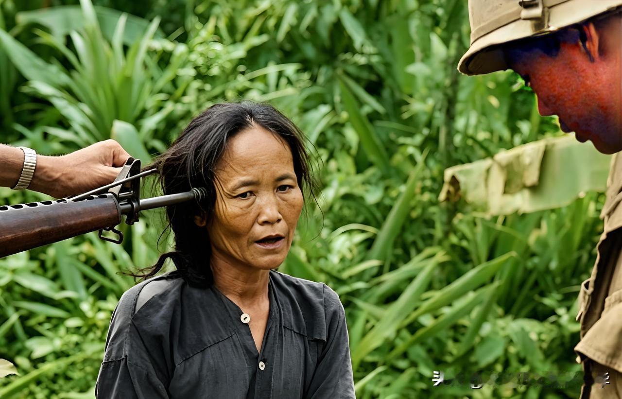在越南南部的热带丛林地带,两名韩军士兵逮捕了一名越南妇女,因怀疑她是越南共产党游击队员,用枪指着她的脑袋进行盘问。这名越南妇女穿着简单的越南传统上衣,被俘虏后她的表情混杂着恐惧、麻木与绝望。