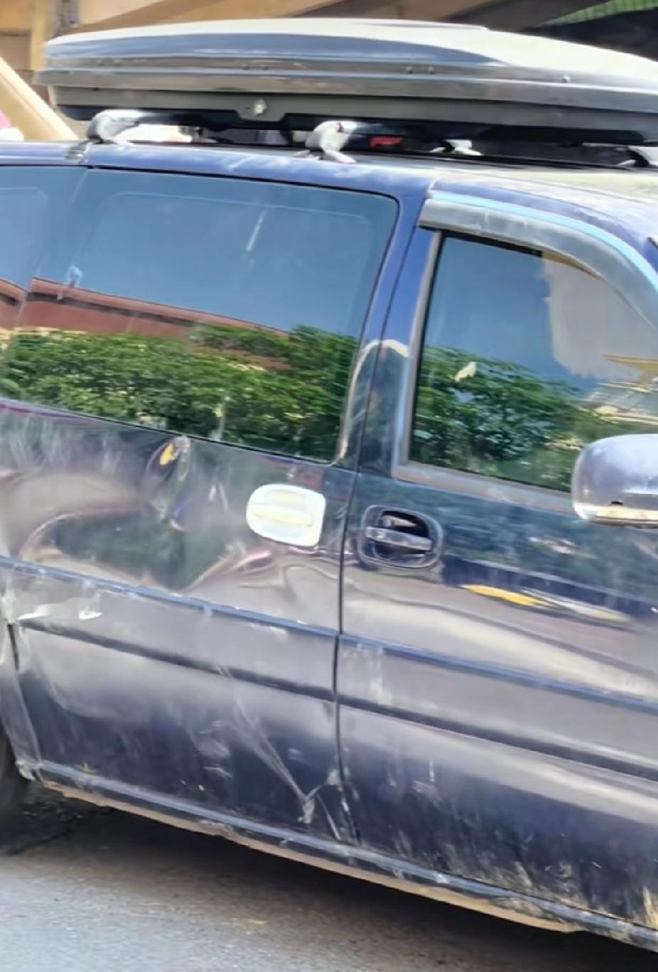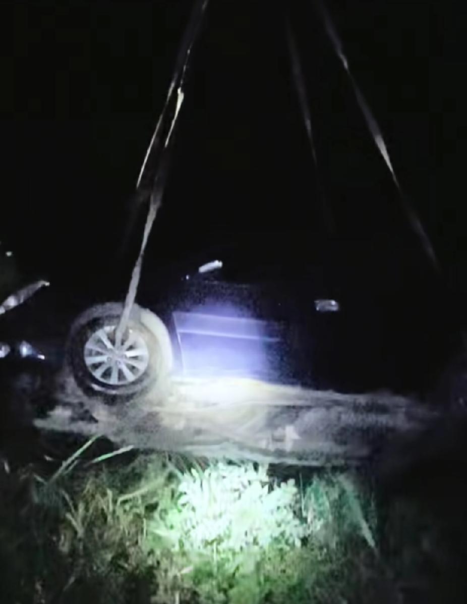 他看到车辆右边变形严重,保险杠被压缩。随后他爬上山崖求助,他等到天黑时,等来吊车,把车辆从山崖下给吊了上来。