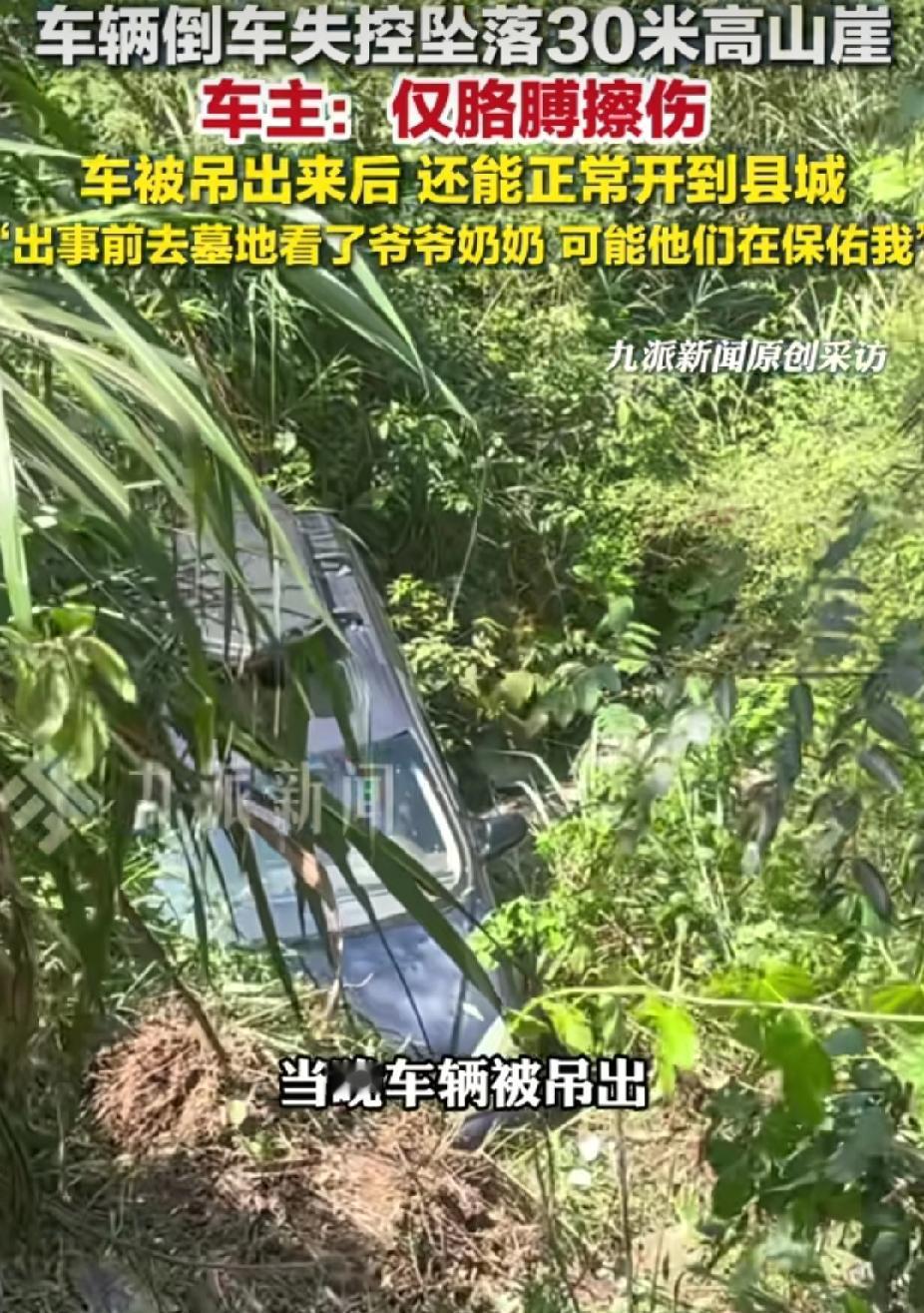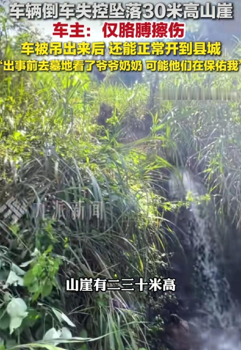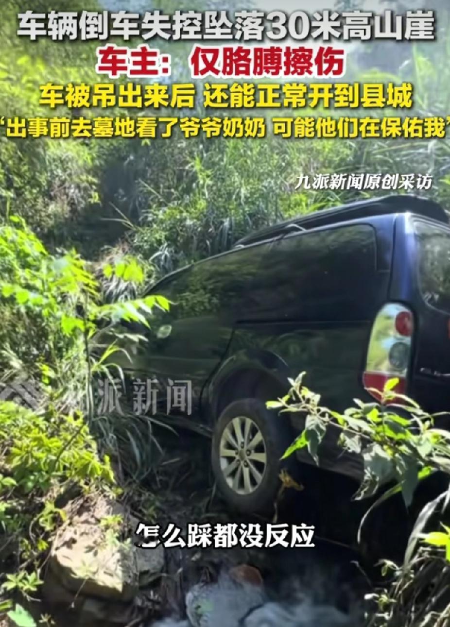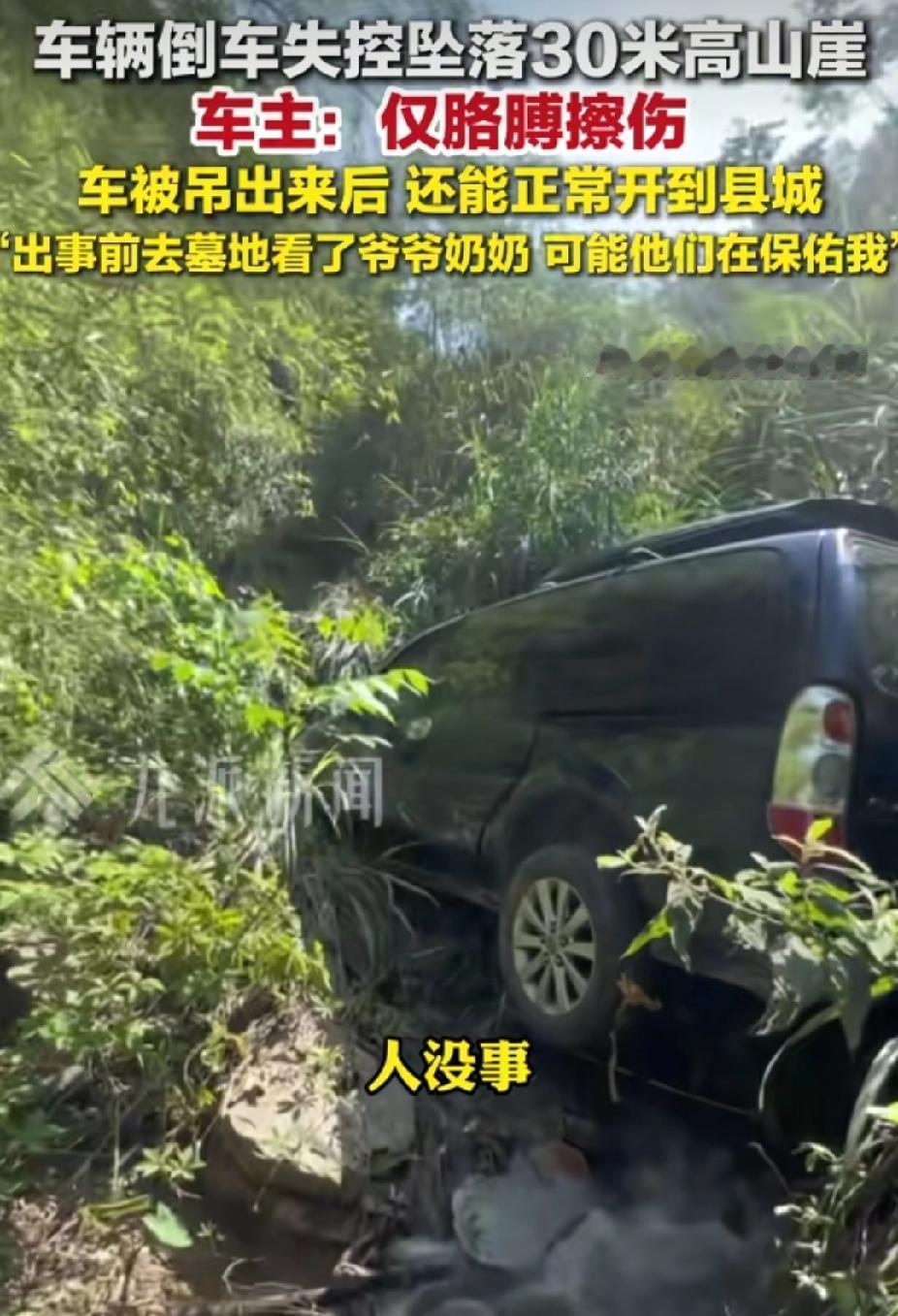 杨先生随着车辆坠崖仅擦伤,他自称“爷爷奶奶保佑”,这是是奇迹,更是敬畏!