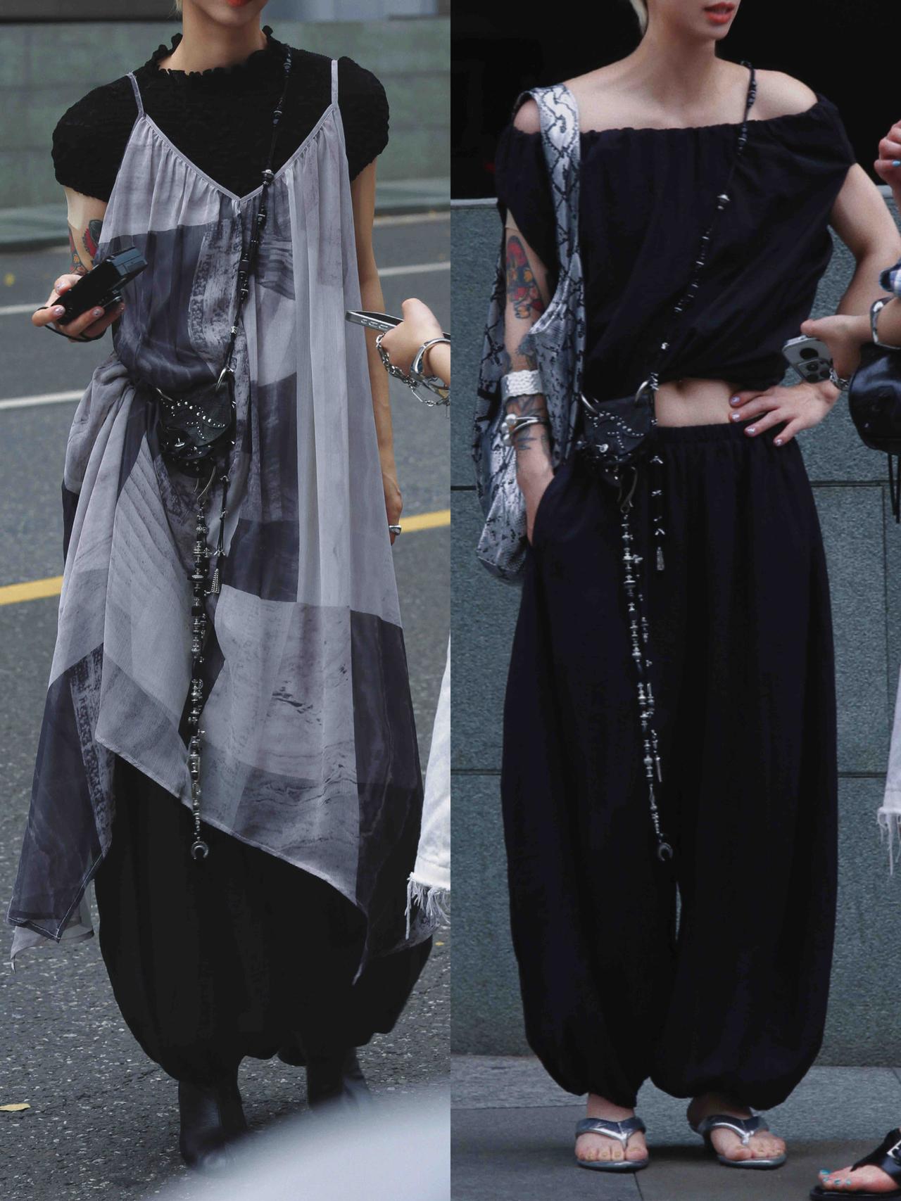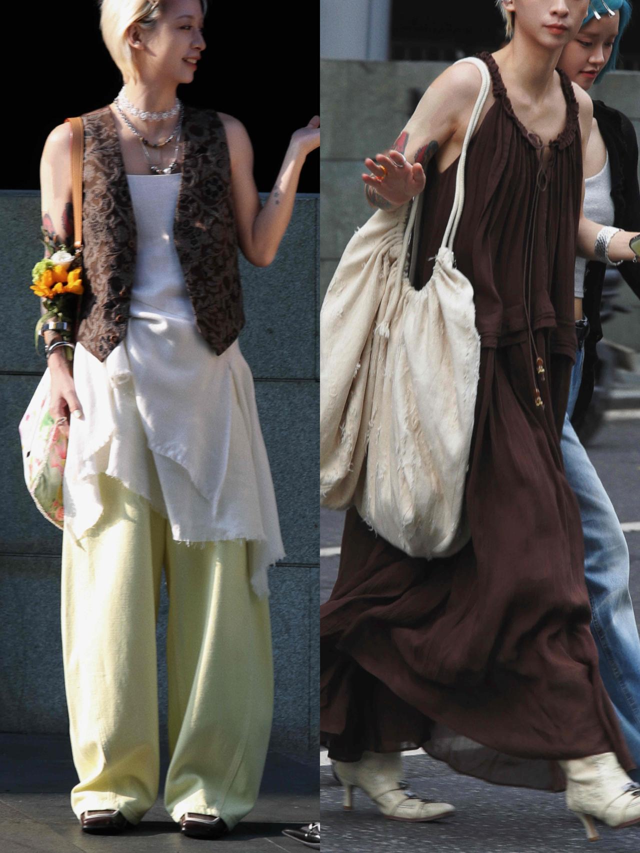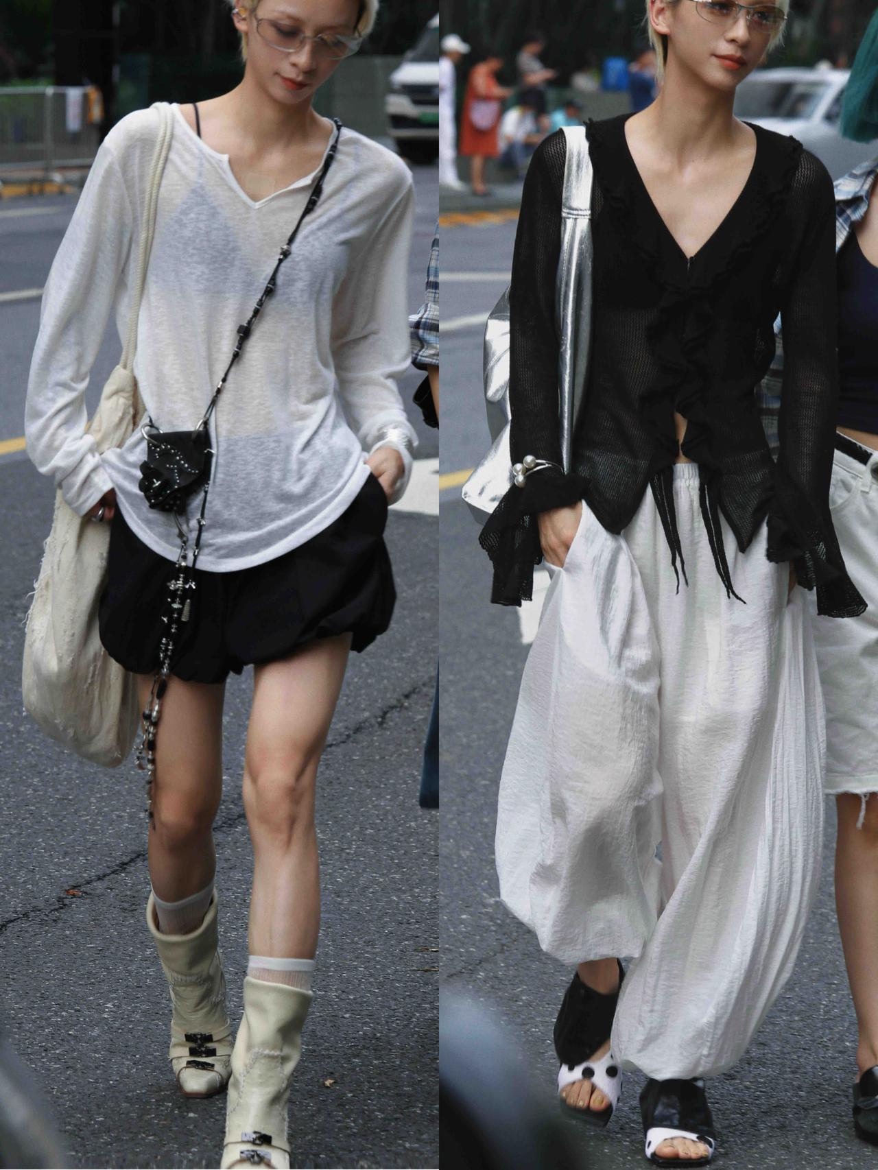 松弛感黑白穿搭自带清冷氛围感,薄透罩衫、垂感灯笼裤搭配做旧帆布包,随性又有层次。亮黄单品打破沉闷,银饰与链条配饰点亮细节,软靴、穆勒鞋适配多种风格。低饱和色系混搭,把慵懒和酷感平衡得刚刚好,街头吸睛又不费力,随便一拍都是时髦大片感。
