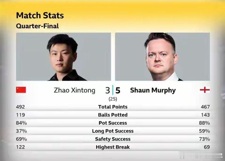 斯诺克世锦赛1/4决赛战报2026斯诺克世锦赛八强战,赵心童对阵肖恩·墨菲,第一阶段八局战罢,赵心童3-5暂时落后。比赛开局赵心童状态火热,打出单杆122分,再凭借黑球绝杀拿下对局,早早建立3-1的领先优势。不料局势随后急转直下,墨菲接连发力完成逆转,连赢四局实现翻盘,从1-3落后一路追到5-3反超比分。双方第二阶段对决将于4月29日凌晨2点打响,期待赵心童及时调整状态完成翻盘。