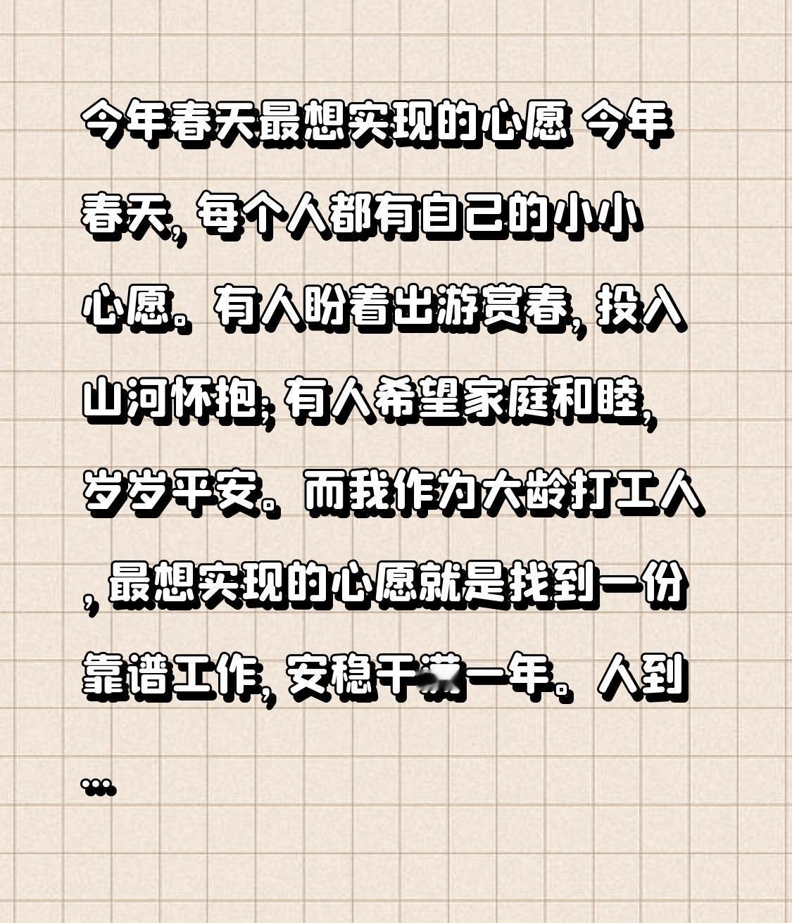 今年春天最想实现的心愿 今年春天,每个人都有自己的小小心愿。有人盼着出游赏春,投入山河怀抱;有人希望家庭和睦,岁岁平安。而我作为大龄打工人,最想实现的心愿就是找到一份靠谱工作,安稳干满一年。