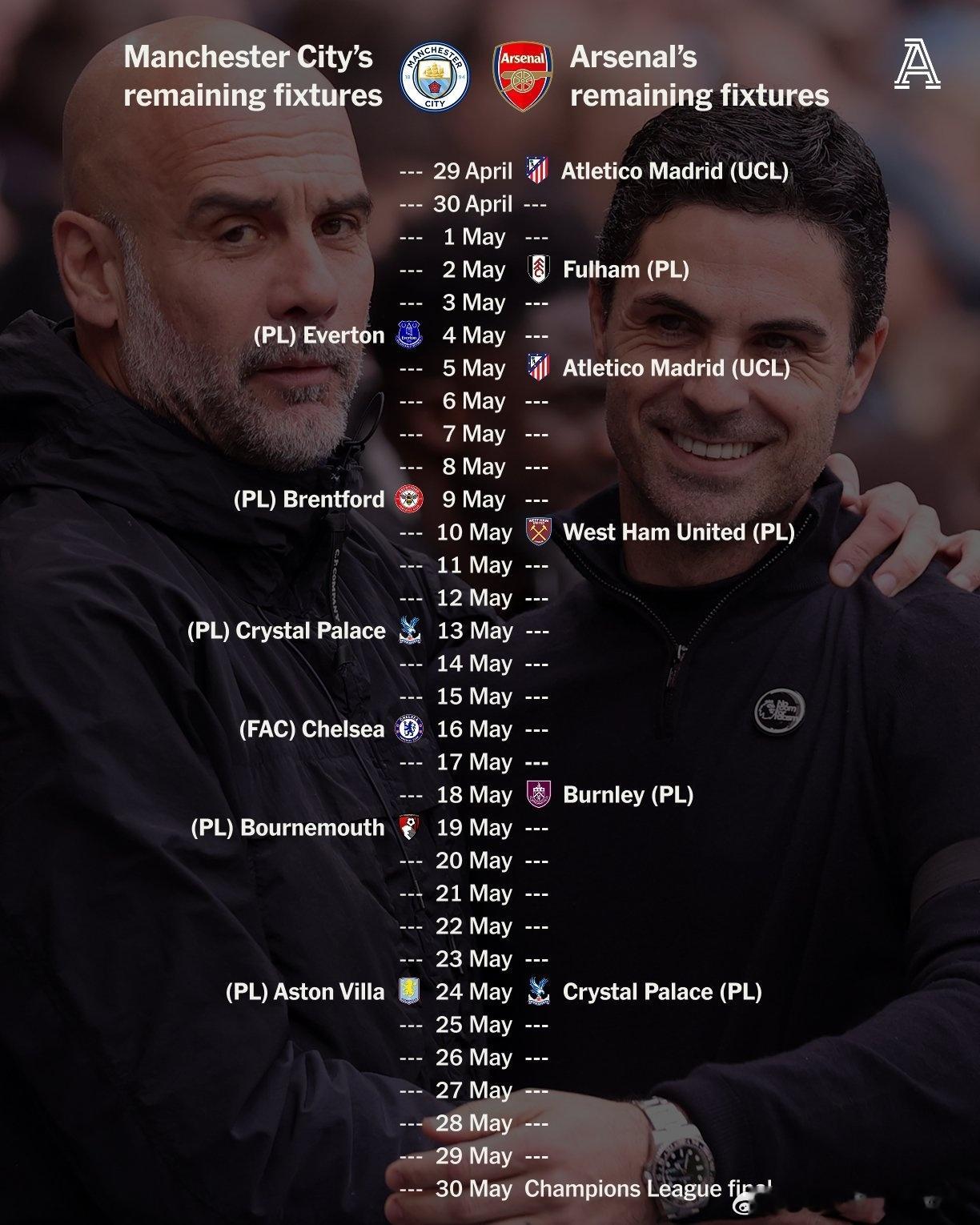 🔴 阿森纳赛程(7天3赛)📅 4月30日 03:00|马竞 vs 阿森纳📅 5月3日 00:30|阿森纳 vs 富勒姆📅 5月6日 03:00|阿森纳 vs 马竞