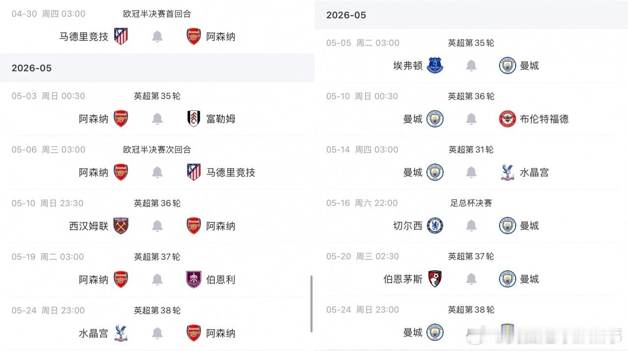 🔵 曼城赛程(7天3赛)📅 5月14日 03:00|曼城 vs 水晶宫📅 5月16日 22:00|切尔西 vs 曼城📅 5月20日 02:30|伯恩茅斯 vs 曼城