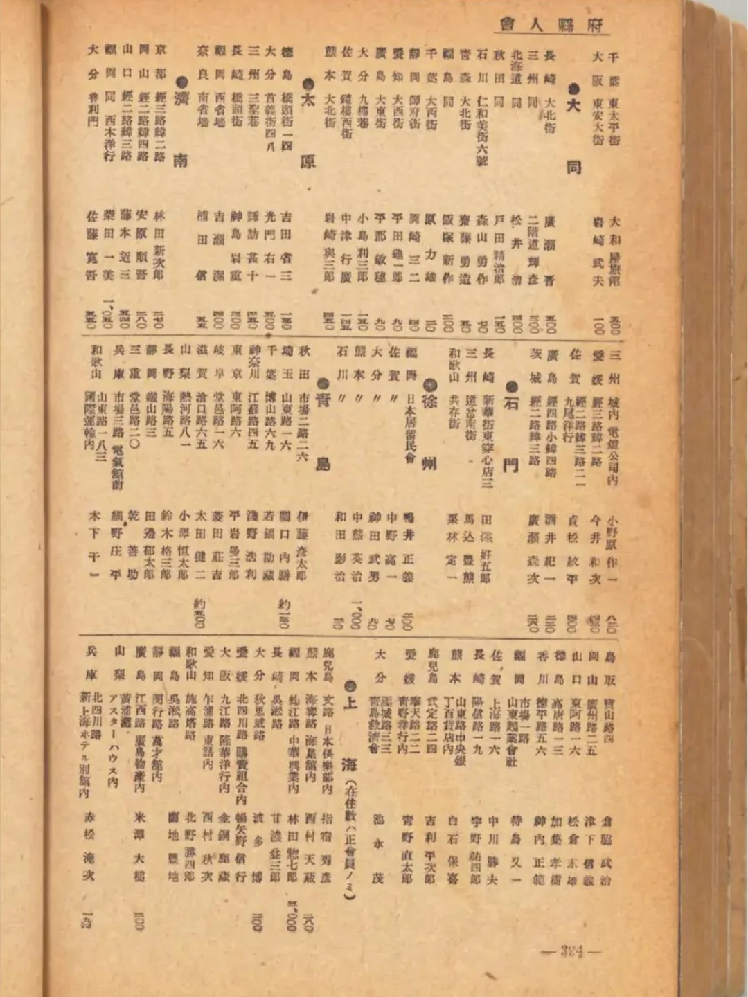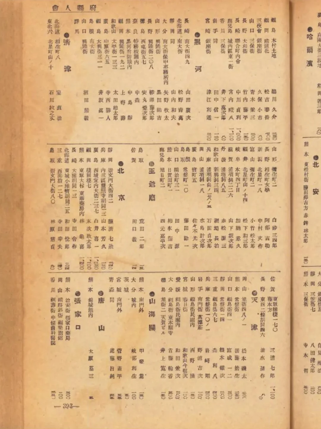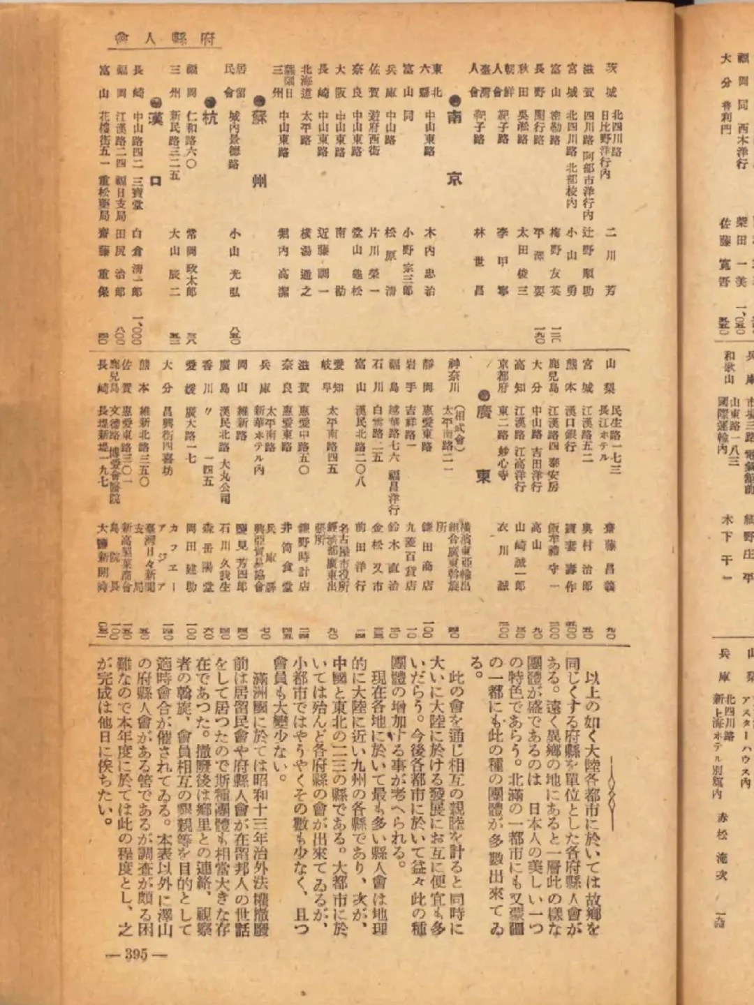 日文称作“府县人会”,有大连、旅顺、鞍山、辽阳、奉天(沈阳)、营口、抚顺、安东(丹东)、新京(长春)、北京、天津、唐山、大同、南京、苏州、徐州、青岛、上海等城市。