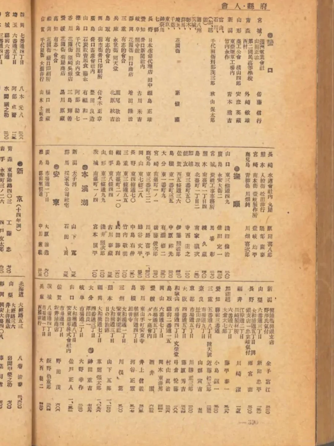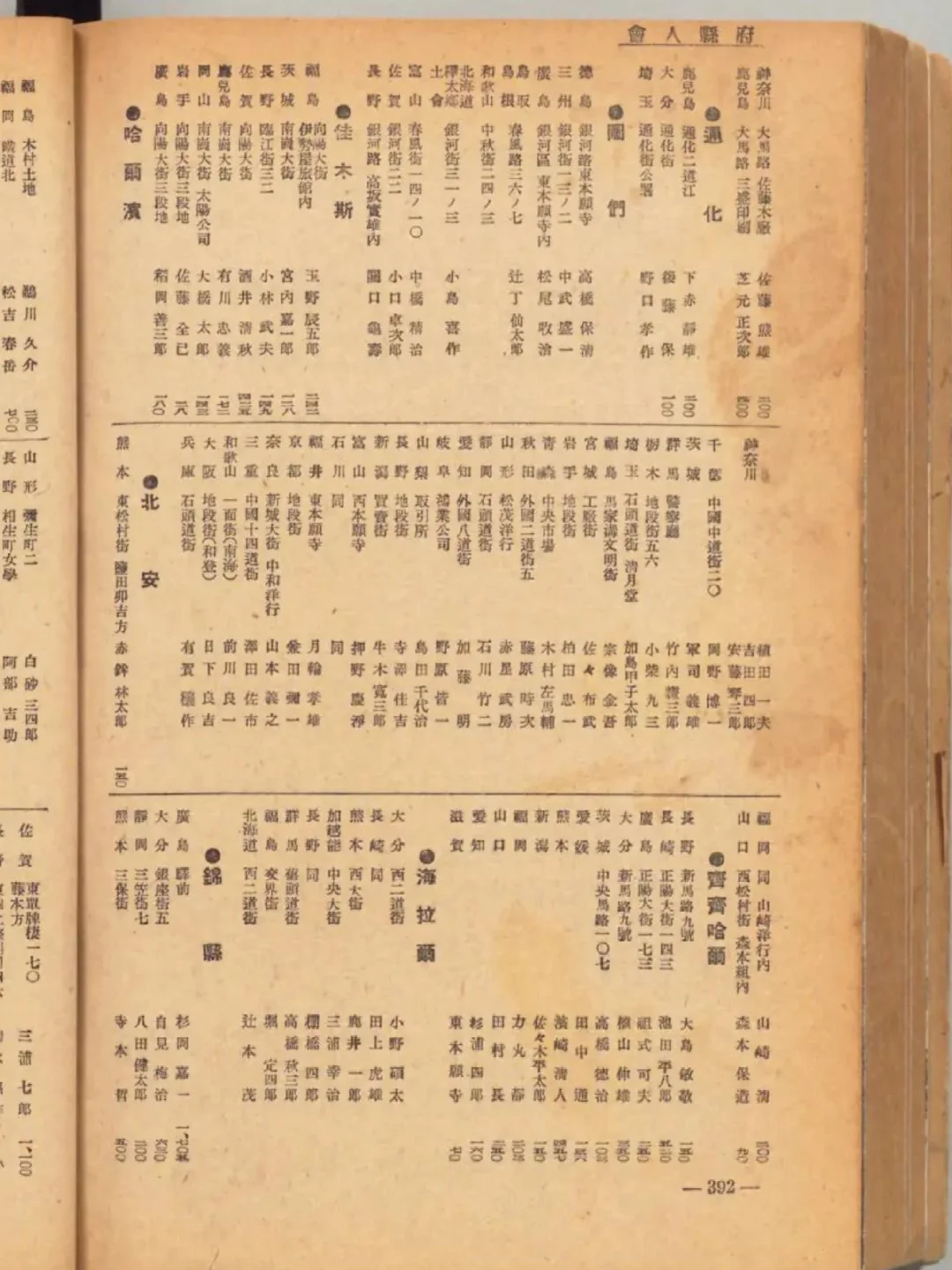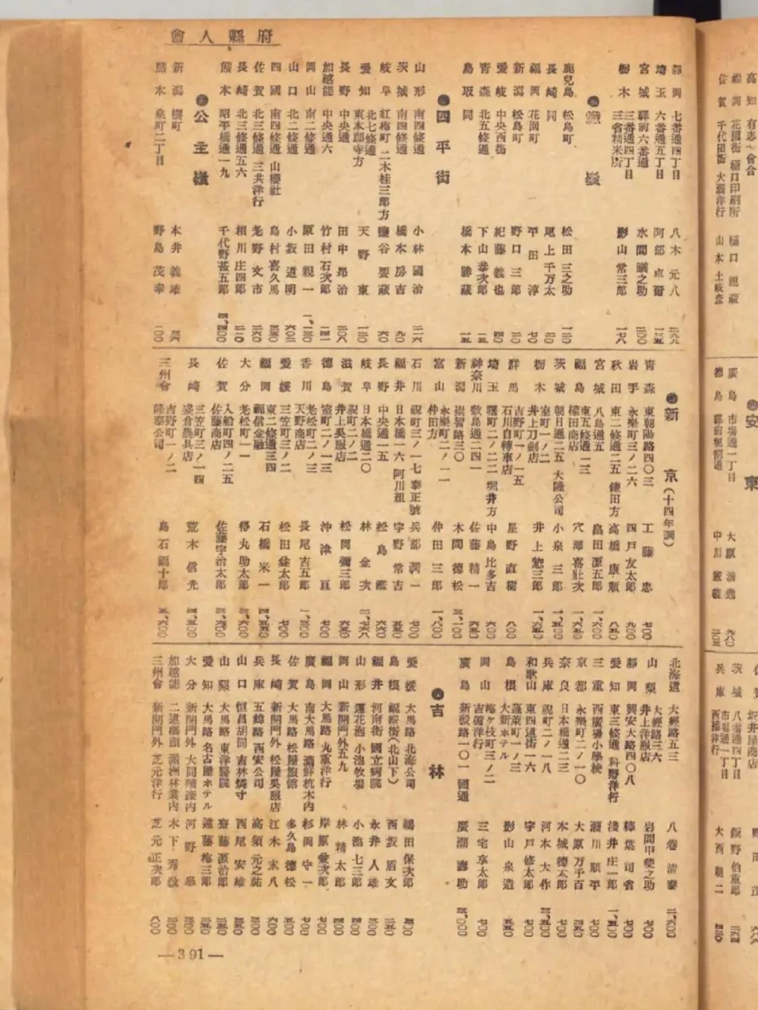 日文称作“府县人会”,有大连、旅顺、鞍山、辽阳、奉天(沈阳)、营口、抚顺、安东(丹东)、新京(长春)、北京、天津、唐山、大同、南京、苏州、徐州、青岛、上海等城市。